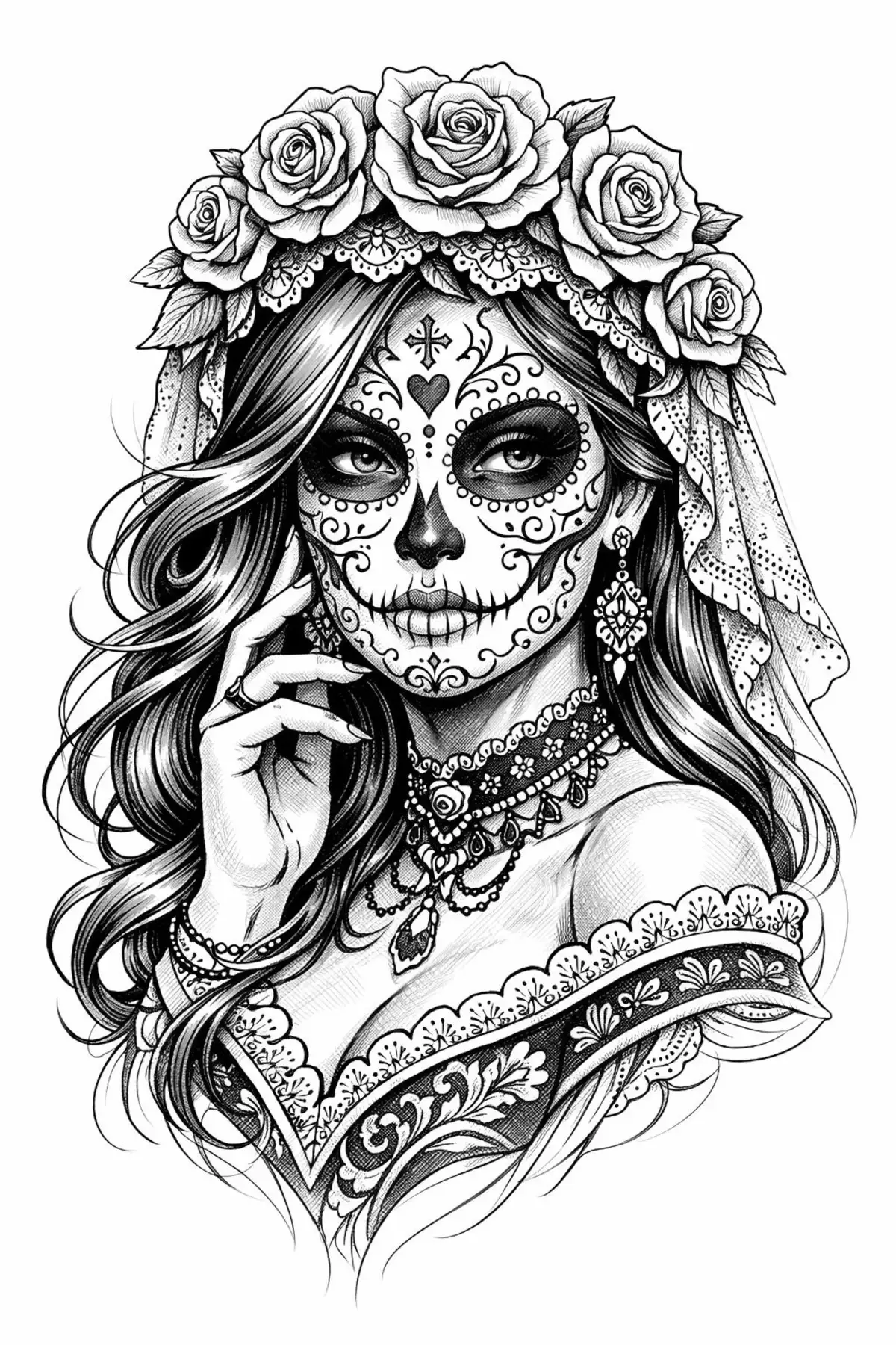 Prompt: Catrina tattoo design in black and white line art style, featuring a sugar skull-inspired woman with elaborate details and patterns, her face adorned with floral motifs and curvilinear lines, her eyes and mouth stylized with bold strokes, her skin rendered in varying shades of gray, with flowing hair and ornate clothing, set against a minimalist background that lets the subject take center stage, with delicate lines and subtle shading to create a sense of depth and dimensionality.
