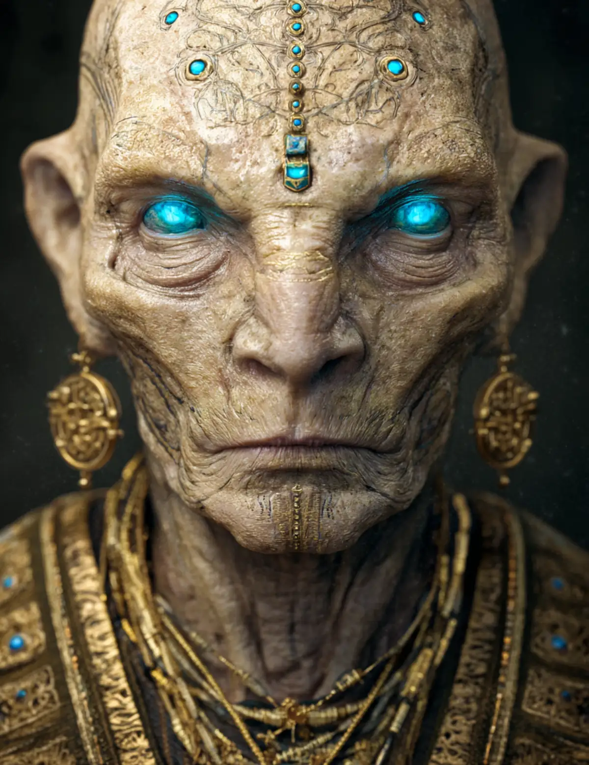 Prompt: a photorealistic portrait of an ancient alien with blue eyes, wearing ornate gold jewelry and robes. the skin is pale beige and textured like leather or hide. the face has no hair, but for intricate facial tattoos, and the alien wears large golden earrings. the head glows cyan, as if it's illuminated from within.