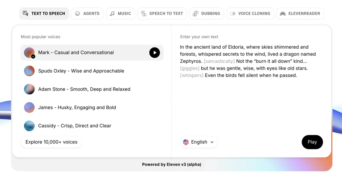ElevenLabs creates a digital clone of your voice from just a few minutes of audio samples. Use it for podcasts, audiobooks, videos, or any content where you want your voice without recording every word.