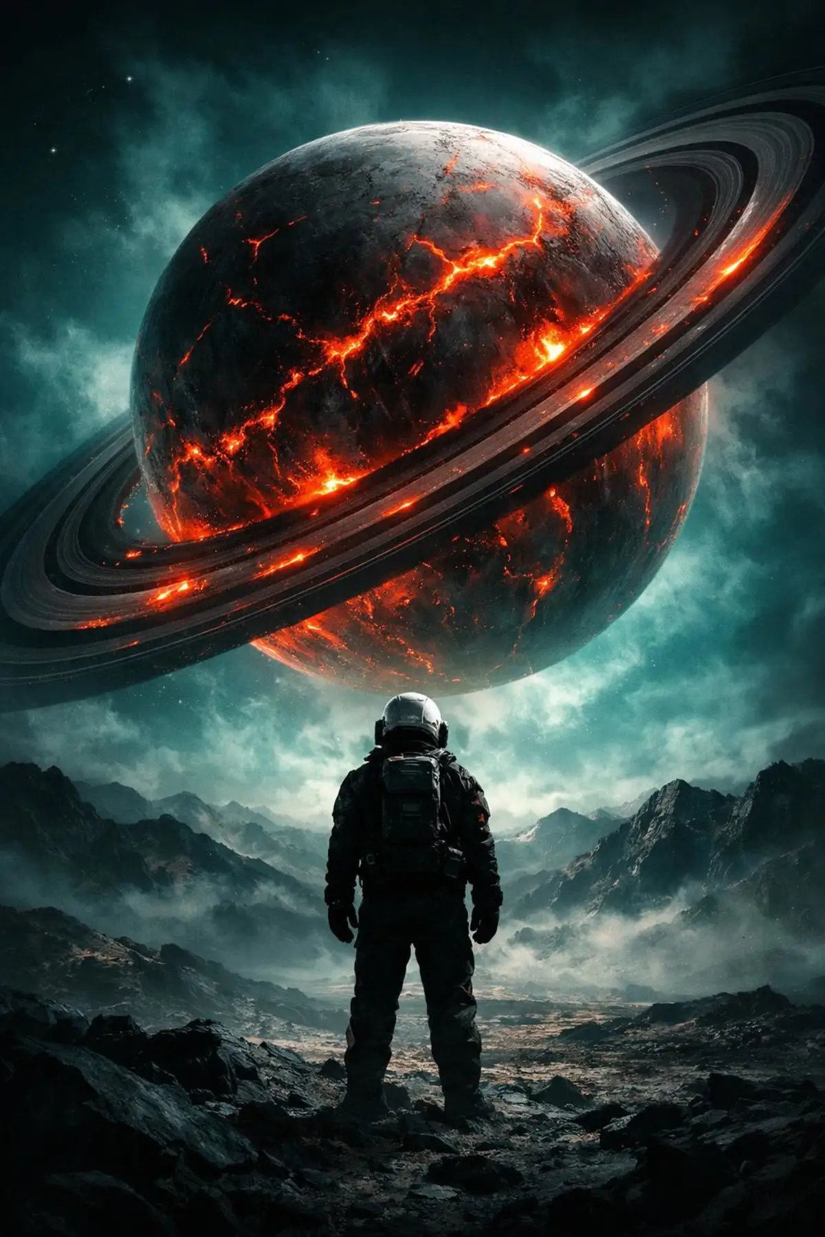 Prompt: A dramatic digital shot of an astronaut standing on a barren, rocky planet surface with a massive glowing planet in the background. The astronaut wears a dark space suit with a white helmet and stands in silhouette against the cosmic scene. The main planet features dramatic ring systems in dark gray with bright red-orange glowing areas and cracks across its surface. The overall color palette consists of deep teals, blacks, grays, and bold red-orange highlights.