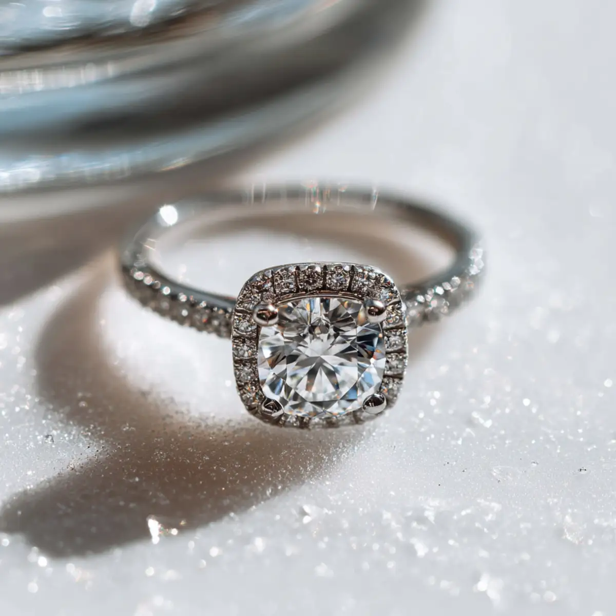 Prompt: macro shot of 14K white gold halo engagement ring on frosted glass plate, soft winter sunlight reflection, subtle glitter accents around ring, luxury minimalistic product photo, photorealistic diamond brilliance