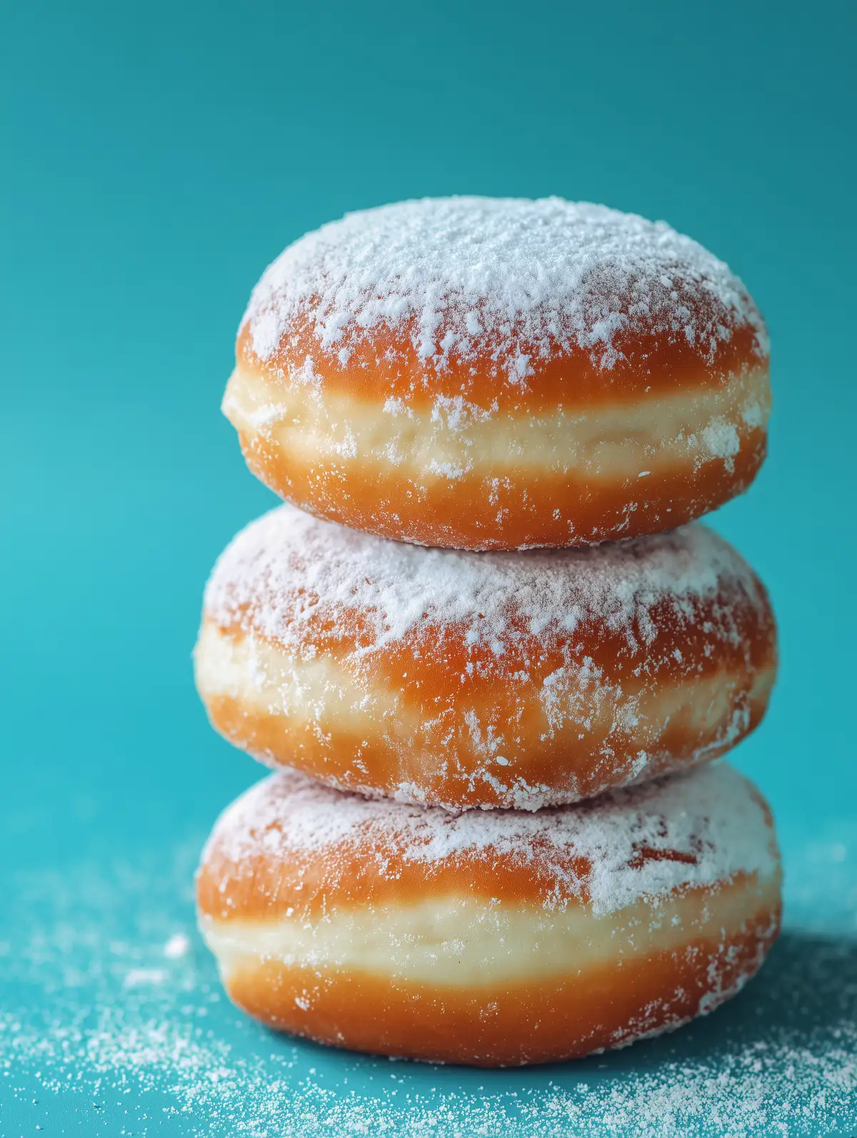 Prompt: trzy pączki, turquoise solid background --ar 3:4 --raw