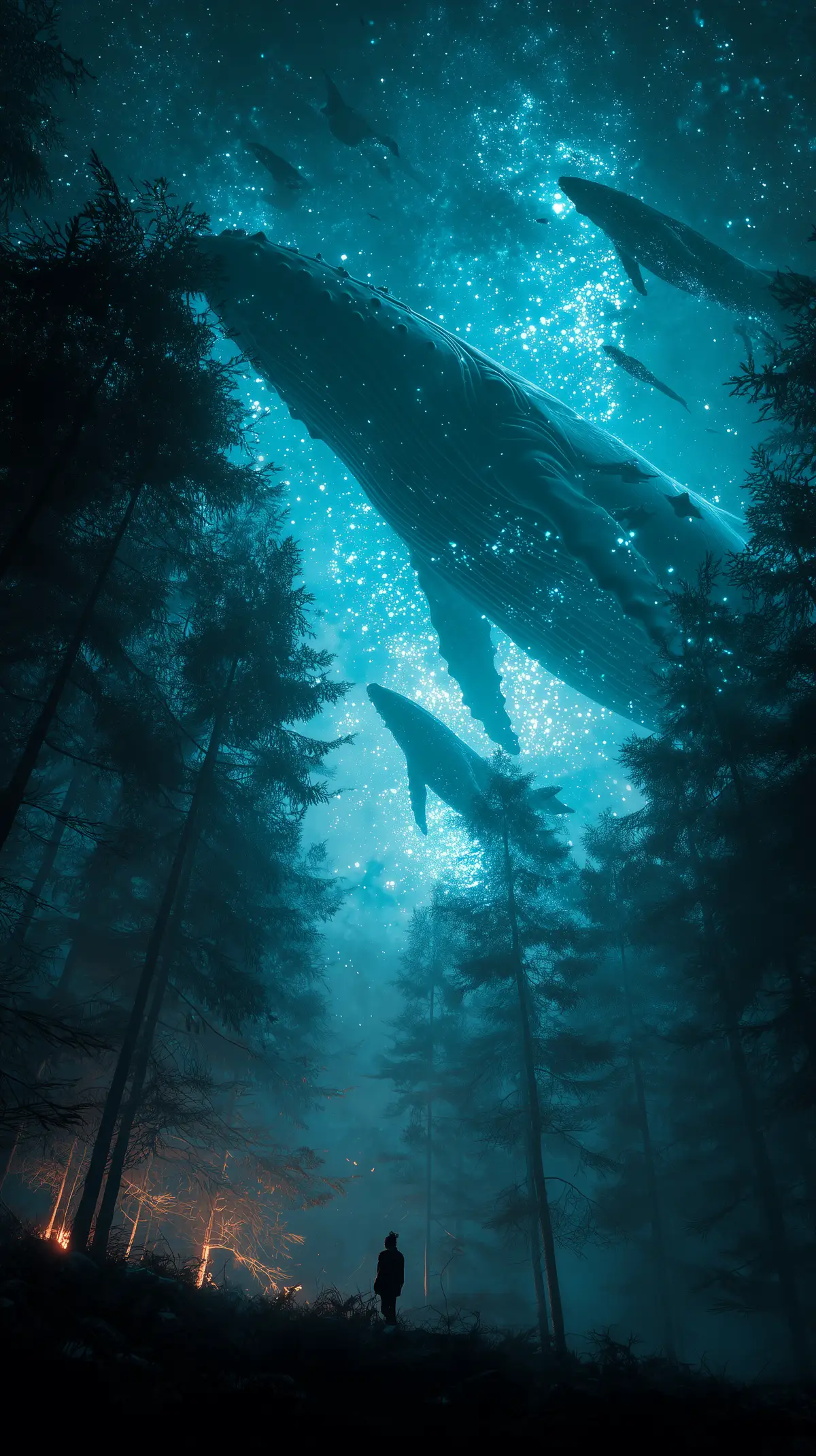 Prompt: A group of birds are flying over the forest, sunlight coming through, long distance, in a minimalist style, in the style of canon eos r5. real photos, a massive glowing cosmic whale made of stars and light floating in the night sky above a desert, a lone person standing below for scale, deep blue atmosphere, teal and orange lighting contrast, cinematic composition, ultra detailed, clean --ar 9:16