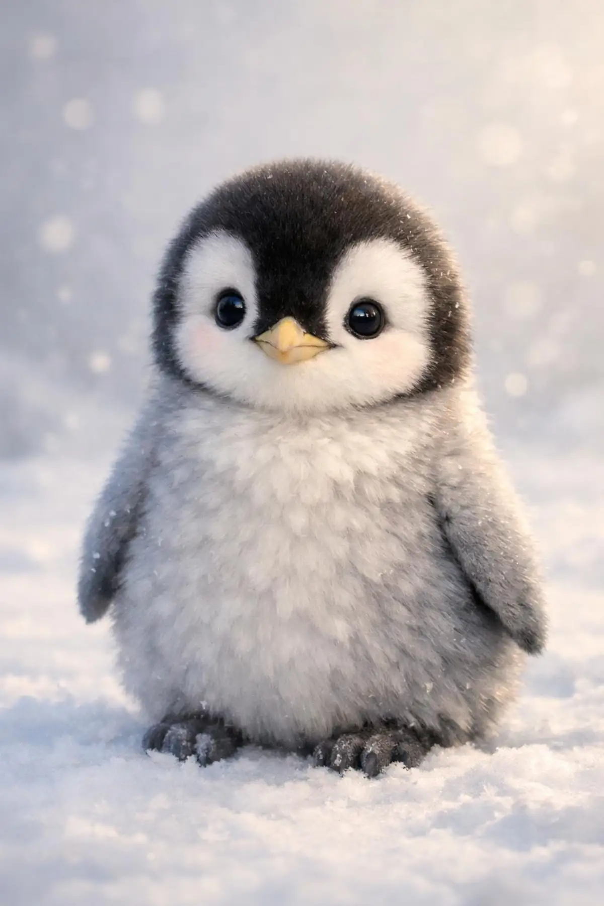 Prompt: A cute penguin with soft, fluffy feathers, big round eyes, and a small beak, standing on a snowy surface with a serene expression, surrounded by gentle, warm lighting, and a color palette of whites, grays, and blues, with intricate details on its feathers and a sense of innocence and charm, the penguin's facial features are delicate, with a slight smile, and its skin is a pale yellow, the overall atmosphere is peaceful and heartwarming, with the penguin being the main focus of the image, set against a simple, muted background that accentuates its cuteness.