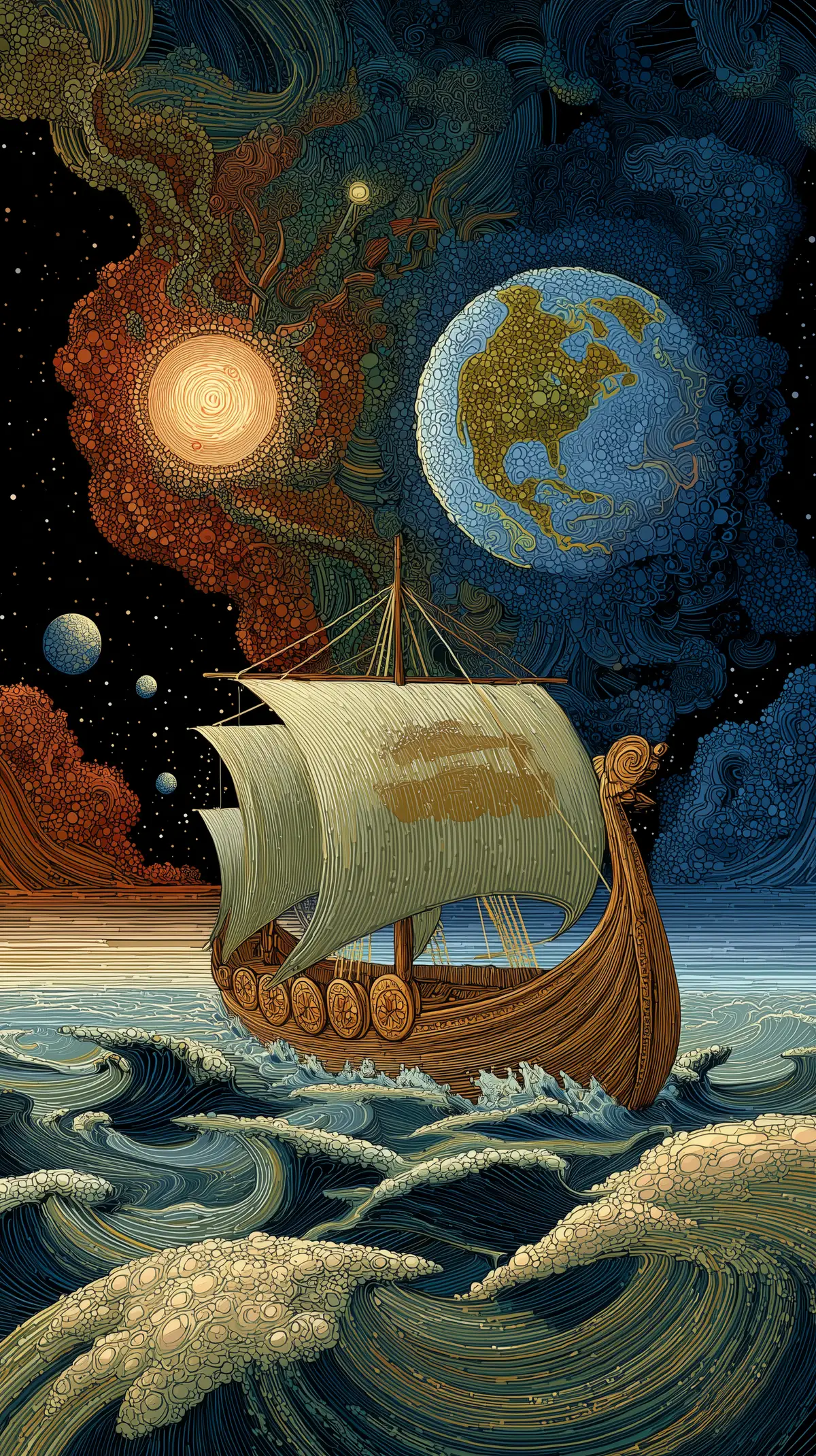 M.C. Escher style, a Viking longship sailing on a cosmic ocean, waves made of shimmering stardust, the ship detailed and majestic, surrounded by a black space background filled with distant stars and nebulae, a fractal sky above with swirling clouds of cosmic colors, a glowing sun on one side and the Earth at night on the other, colorful and highly detailed.