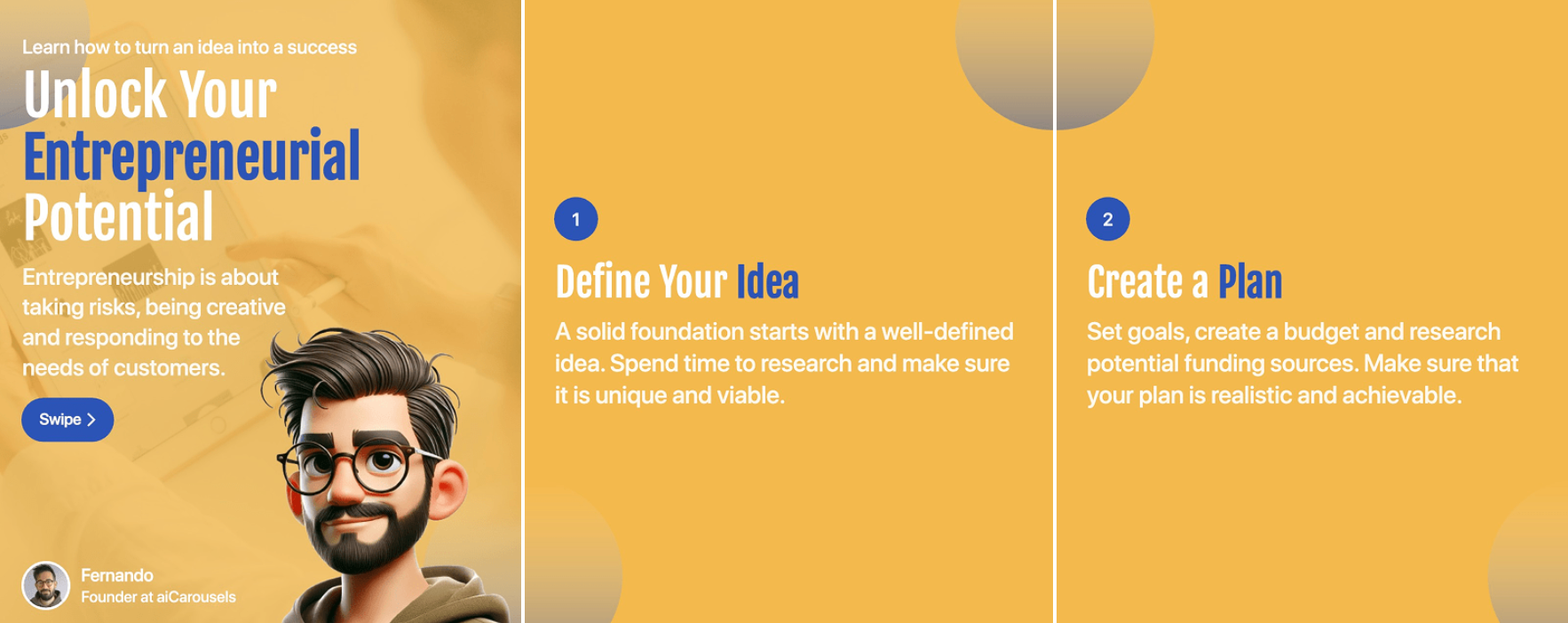 aiCarousels writes and designs professional carousel posts for LinkedIn, Instagram, and TikTok. Enter a topic or paste your existing content, and the AI generates eye-catching slides with auto-formatted text and coordinated colors.