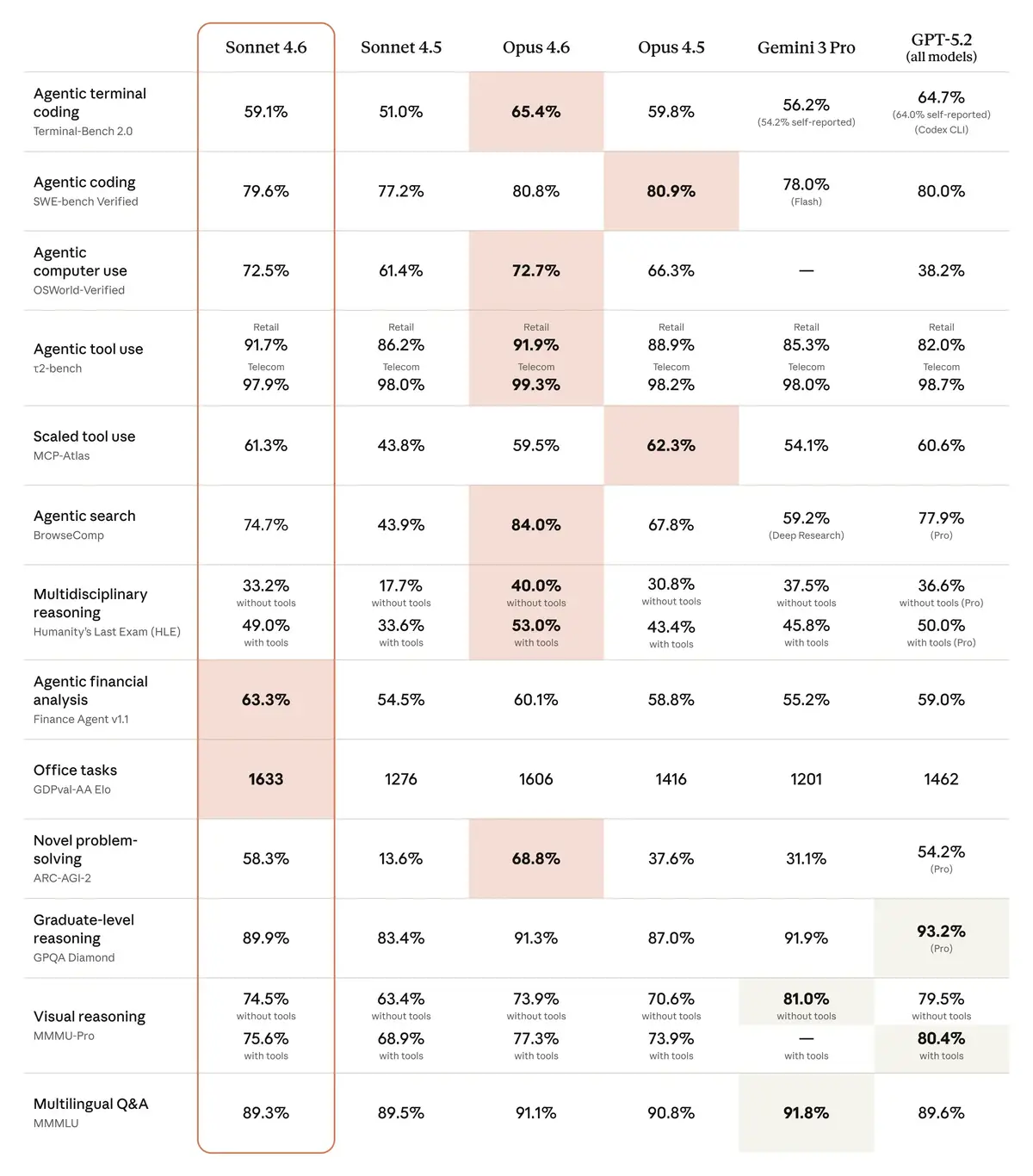 OpenAI feels the pressure from both sides. The same week Sonnet 4.6 launched, OpenAI hired the creator of OpenClaw, an open-source computer use tool, signaling it's scrambling to close a gap on agent capability that Anthropic has owned for over a year. GPT-5.2 trails badly on agentic computer use: 38.2% to Sonnet's 72.5%. On financial analysis, 59.0% versus 63.3%. Google's Gemini 3 Pro competes well on multilingual and visual reasoning but falls behind on the agentic categories where enterprise budgets are moving fastest.