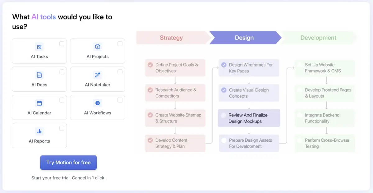 Motion uses AI to automatically prioritize your tasks and schedule them on your calendar. It considers deadlines, meeting conflicts, and energy levels to build your optimal day, then reschedules dynamically when things change.