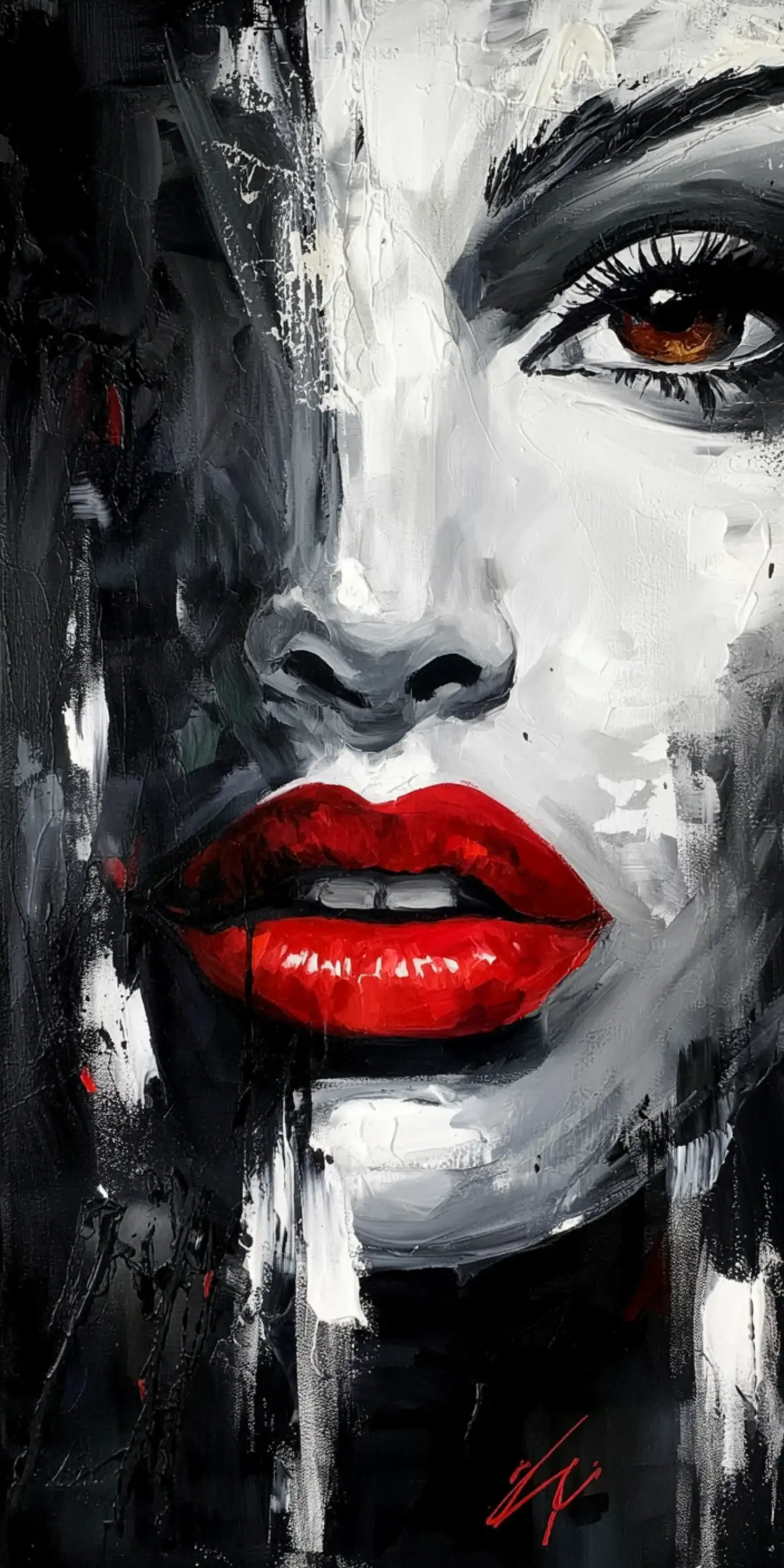 Prompt: A dramatic close-up artistic painting of a face with a stark black and white color scheme, featuring vibrant red lips as the focal point. The lips are painted in bold, glossy red against the monochromatic background, creating a striking contrast. The right side of the face is painted in white, while the left side transitions into deep black. The eye is rendered in realistic detail with a warm brown iris and defined eyelashes, positioned in the upper right corner of the composition. The nose is painted in dark gray tones. The painting style is expressive with visible brushstrokes and texture, particularly in the black areas. The background features abstract black and white paint splatters and brush marks. The signature "SC" appears in red at the bottom right corner. The overall composition creates a dramatic noir-style aesthetic with the bold red lips serving as a pop of color against the predominantly monochromatic palette.