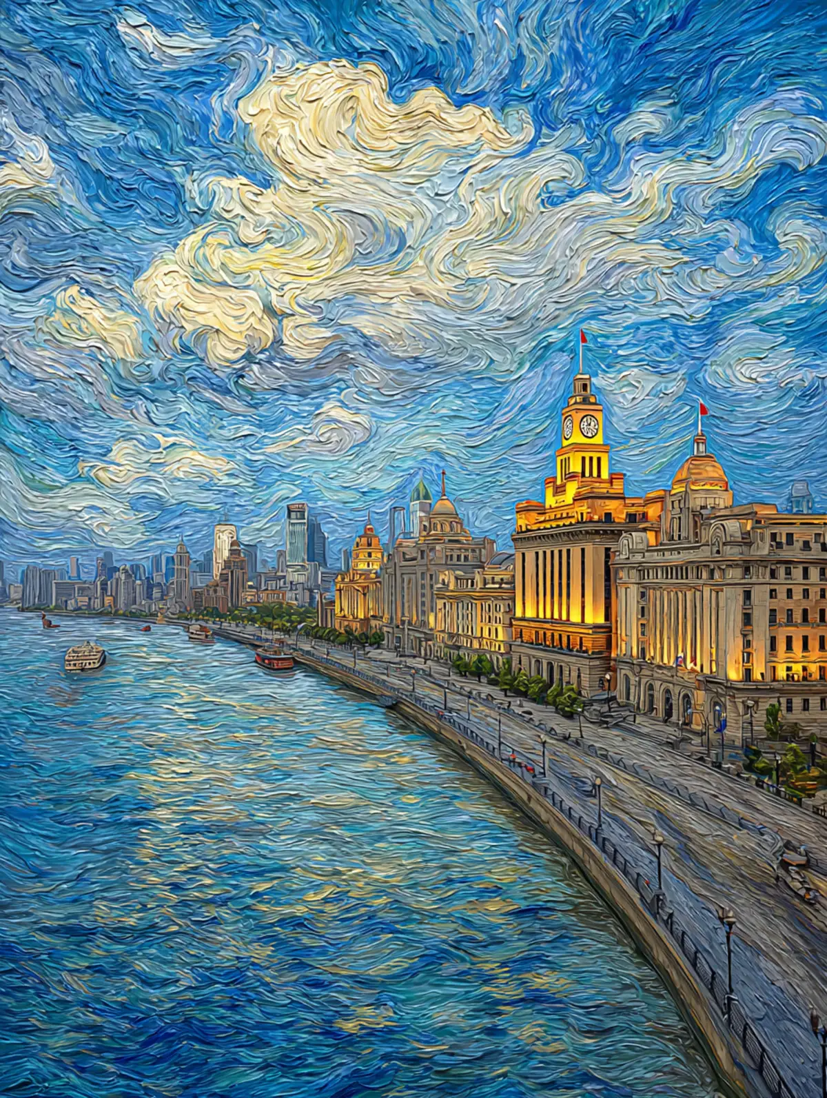 Prompt: Van Gogh style painting of the Bund in Shanghai, historic architecture along the Huangpu River, thick impasto brushstrokes, swirling clouds in the sky, bold cobalt blue and chrome yellow palette, post-impressionist masterpiece, rich oil paint texture, golden hour lighting, 4k, detailed --ar 3:4