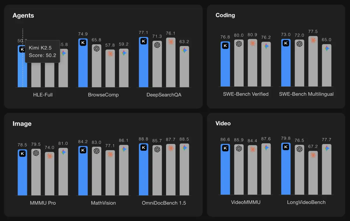 Moonshot positions Kimi K2.5 for knowledge work: coding, document processing, research synthesis. The benchmarks show competitive results against GPT-5.2 and Claude 4.5 Opus across coding and agentic search tasks, often at lower cost. Their HLE score with tools reached 50.2 percent, compared to 45.5 percent for GPT-5.2 and 43.2 percent for Claude 4.5 Opus. On SWE-Bench Verified, the coding evaluation, K2.5 hit 76.8 percent.
