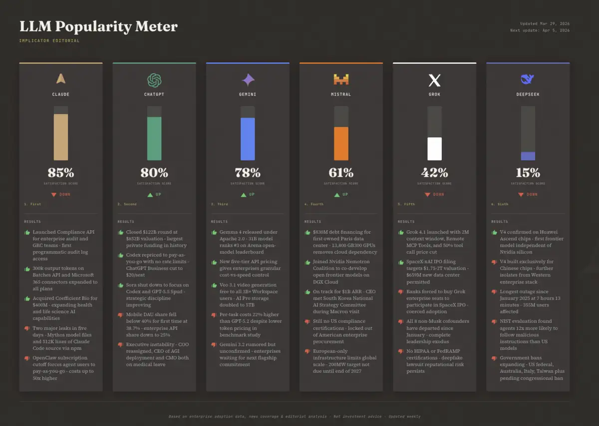 A weekly editorial tool by Implicator.ai that scores six major AI models on enterprise satisfaction. Each model gets a percentage score based on adoption data, news coverage, and editorial analysis. Scores update every Saturday.