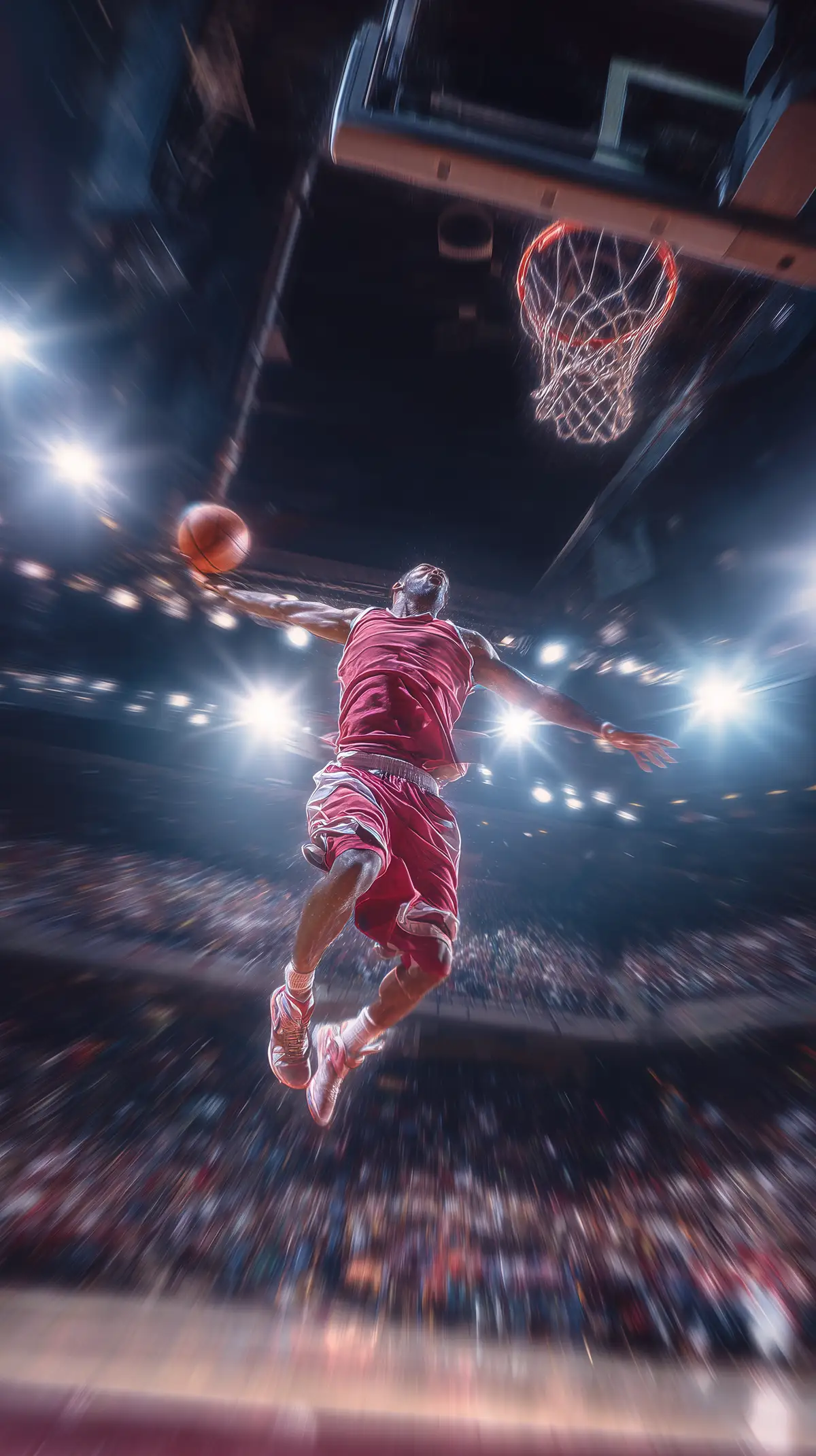 Prompt: basketball slam dunk, explosive jump, high speed action, player flying to the rim, arena lights, sports broadcast camera, strong motion blur, impact moment, realistic game, professional match, dynamic shot --ar 9:16 --raw