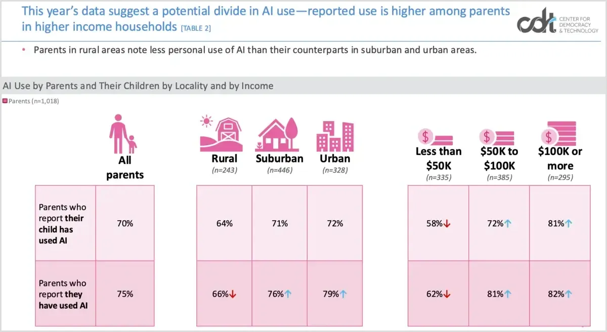 • Risks scale with deployment intensity: 56% in high-use schools feel disconnected from teachers versus 50% overall; deepfake awareness jumps to 61%