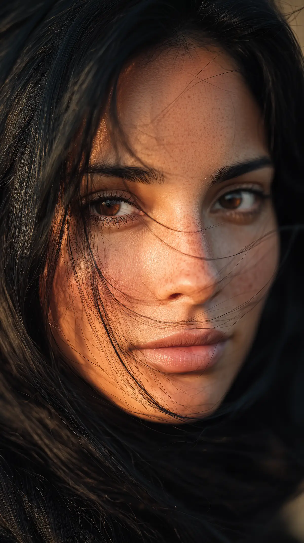 Prompt: Ultra-realistic editorial close-up portrait of a beautiful 30-year-old Italian woman with long black hair, warm olive skin, expressive brown eyes, and natural beauty. Soft wind moves her hair. Shot in golden-hour natural light with a shallow depth of field. Editorial photography, high-end magazine quality, clean realistic skin texture, elegant and cinematic mood.
