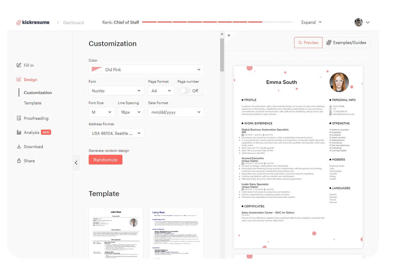 Kickresume uses GPT-4 to generate complete resumes in seconds. Enter your job title, pick a template, and let AI write your work experience, education, and skills sections. It also checks your ATS score and helps tailor resumes to specific job postings.