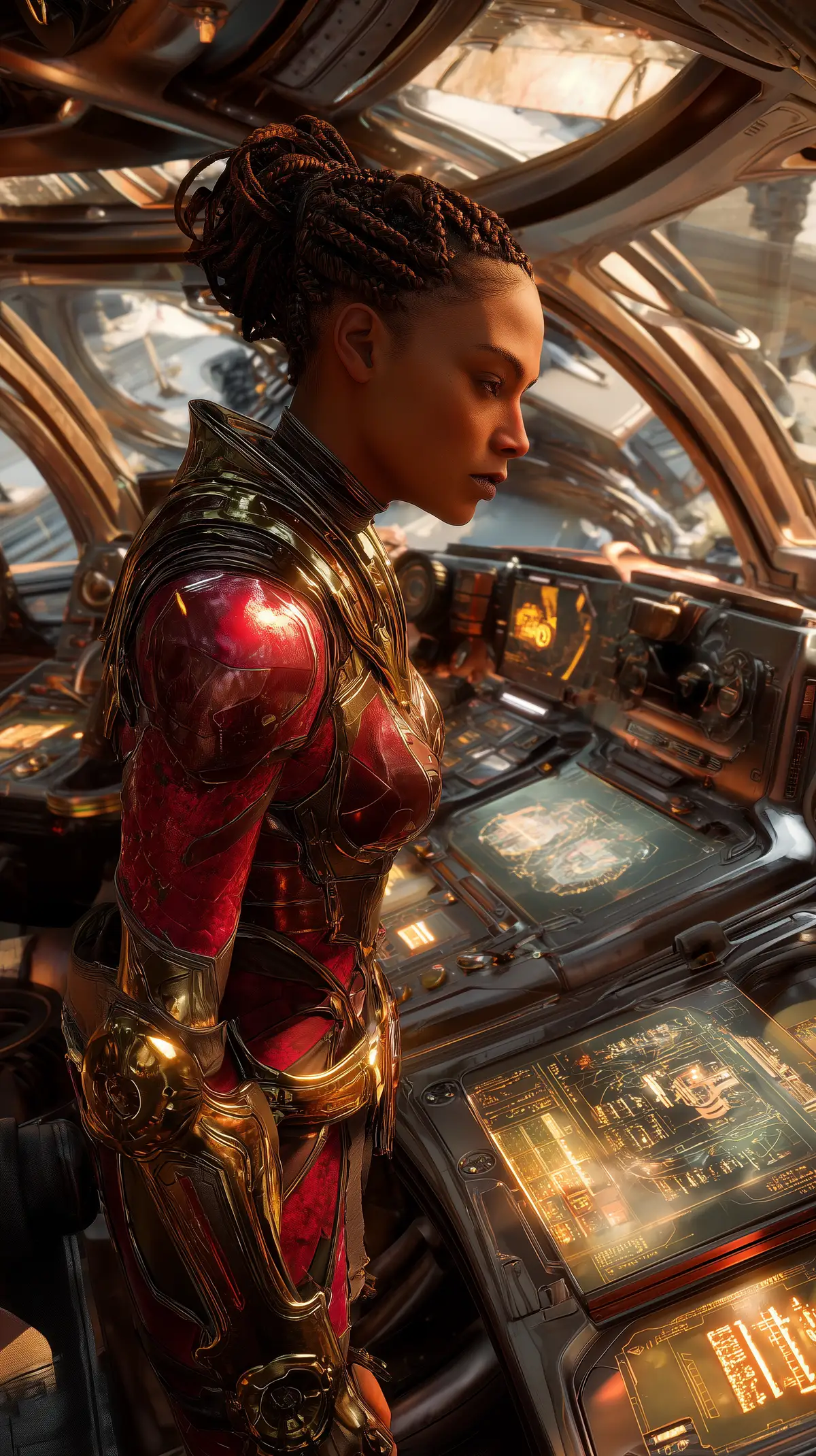 Prompt: A powerful warrior woman inside a retro-futuristic X-Men-style spacecraft, wearing shimmering red and gold armor with intricate metallic detailing, braided hair catching soft highlights, surrounded by holographic control panels and glowing interfaces, cinematic rim lighting reflecting off polished metal surfaces, warm volumetric rays filtering through the ship’s curved windows, ultra-realistic textures, moody sci-fi atmosphere, dynamic wide-angle perspective showing the vast interior architecture of the vessel