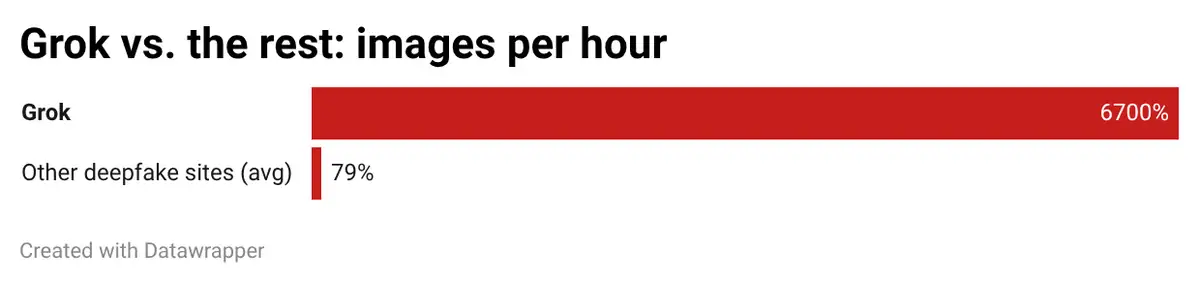 • Grok produced 6,700 sexualized images per hour vs. 79/hour for other deepfake sites combined