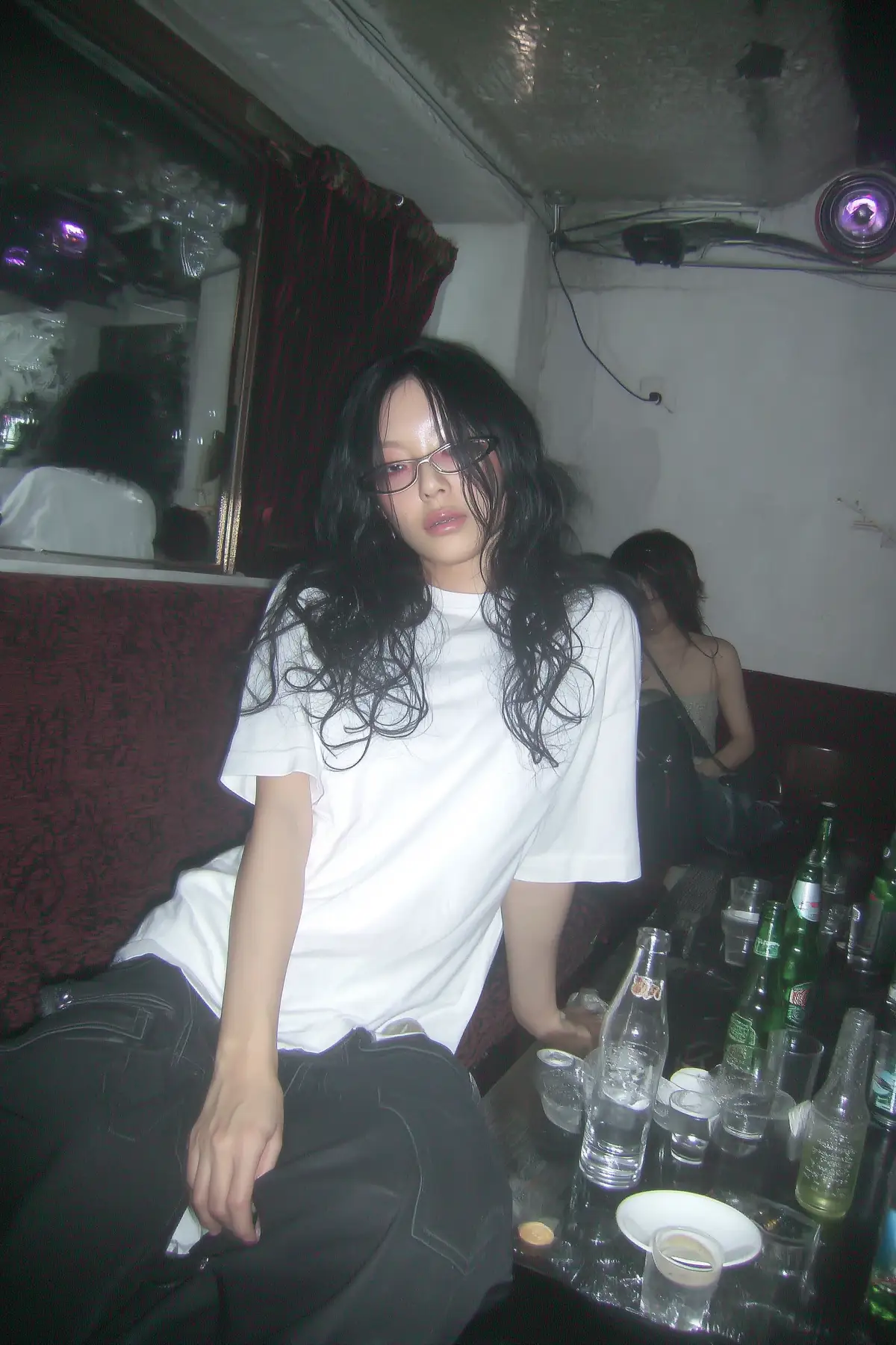 Prompt: A candid flash photograph of an awkward nerdy Asian woman in her 20s with medium-length black curly hair, wearing thick-rimmed glasses. She is wearing a loose-fitting white t-shirt that covers her midsection, and black baggy jeans. She is facing the camera directly but not making eye contact, caught in a natural unposed moment. She sits on a chair at a low black table in a private Korean bar room that looks like a karaoke-style room, with brown sofas, white clean wall, and a high clean ceiling. She is surrounded by other women casually drinking together. Empty soju bottles, small dishes, and beer glasses scatter across the table. Photographed with a Canon PowerShot A80 digital camera, sharp and clear detail, early 2000s digital snapshot style, candid and raw, with harsh flash emphasizing the cramped yet intimate nerdy drinking atmosphere, spontaneous off-balance composition