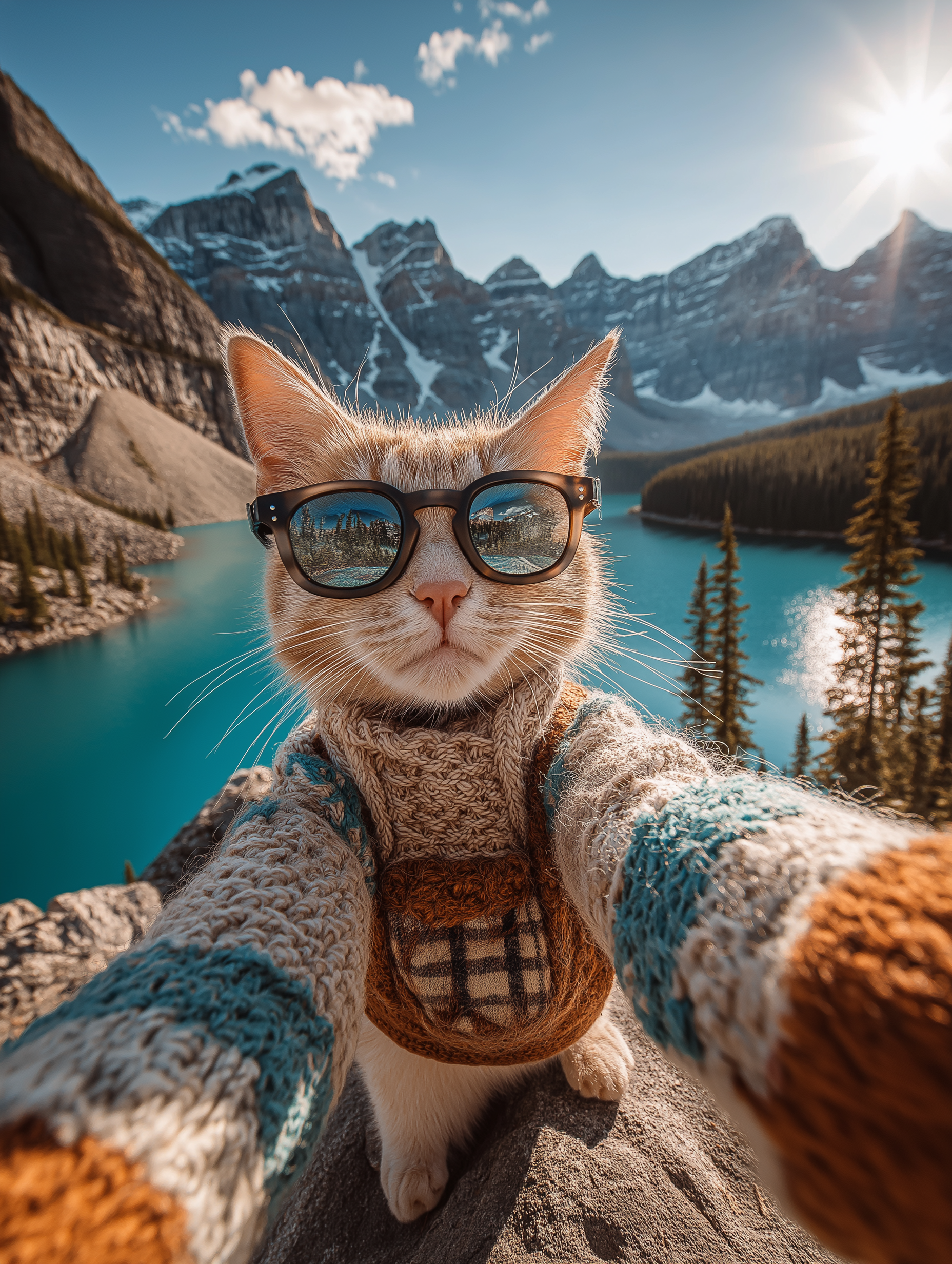 Prompt: A selfie-style photo of the Canadian Rockies. A cat in clothes and sunglasses is taking the selfie in front of the iconic Rockies from cat height. The cat should be alone, no other cats or people in the frame.