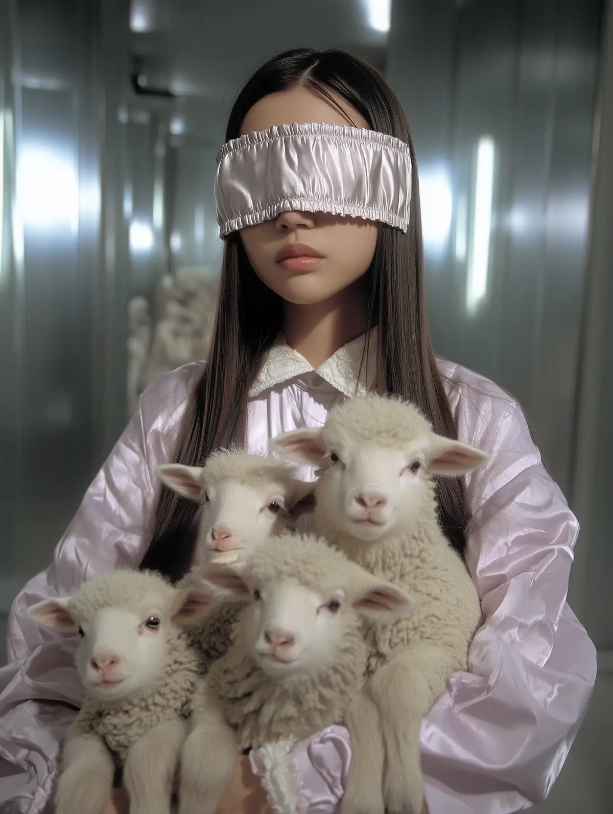 Prompt: a Korean girl standing still, three realistic sheep floating horizontally across their face and eyes like a living blindfold, expression calm and distant, surreal sleep theme, minimal composition, soft diffused lighting, dreamy realism, quiet uncanny atmosphere, pastel beige and dusty cream tones, cinematic stillness