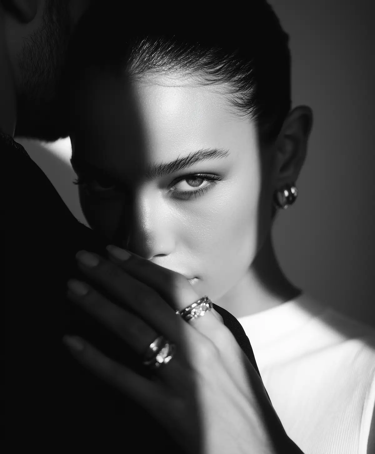Prompt: A black and white artistic portrait photograph with dramatic lighting. The image shows a close-up of a woman's face and a man's hand from behind. The woman has sleek, pulled-back hair and is wearing a white top. Her face is turned slightly to the side, showing defined cheekbones and a contemplative expression. The man's hand enters the frame from the right, wearing multiple rings including a prominent diamond ring. The lighting creates strong contrast between light and shadow, with the left side of the image well-lit and the right side in shadow. The composition is intimate and moody, with the hand delicately positioned near the woman's face. The image has a high fashion editorial quality with sharp detail and professional studio lighting techniques.