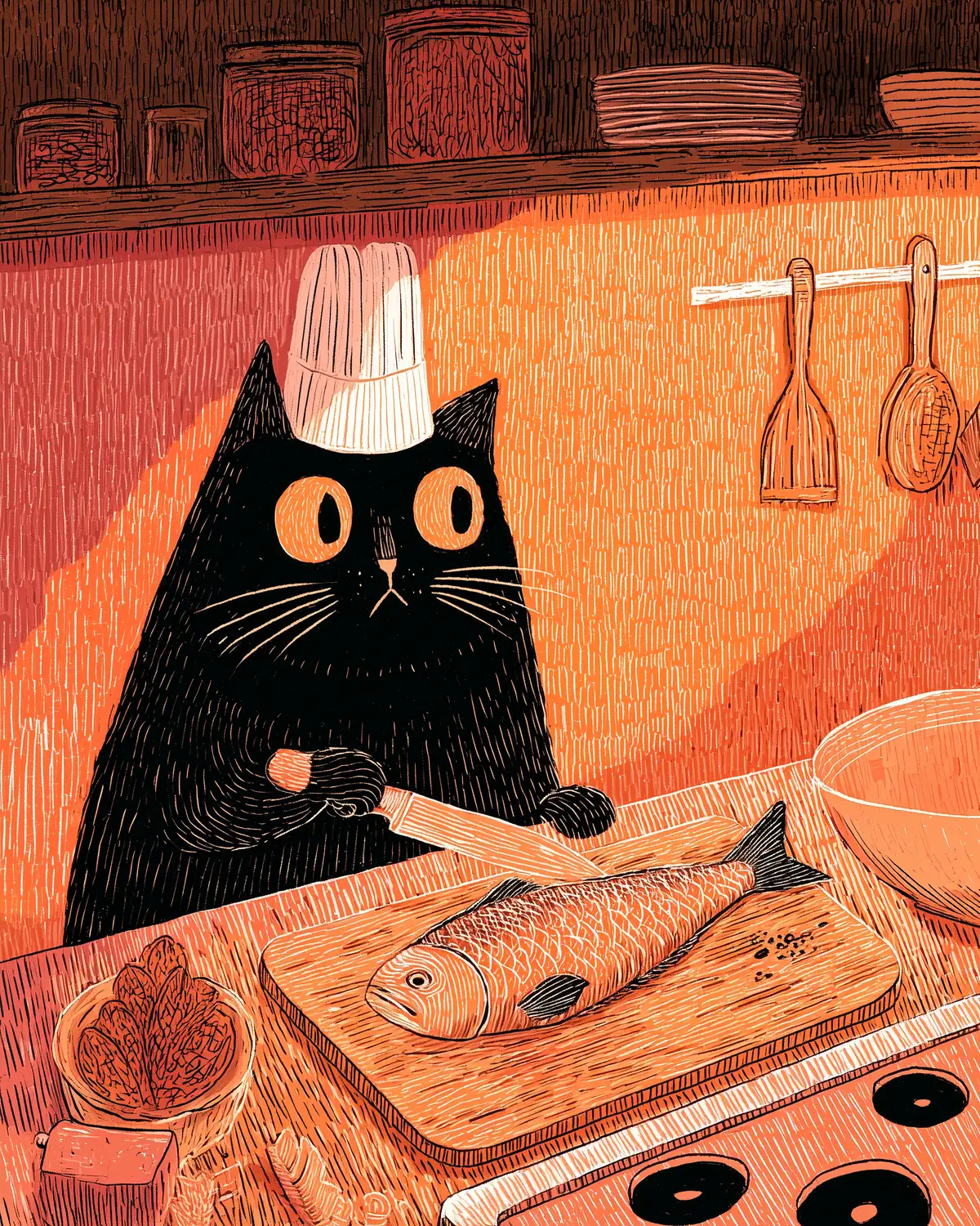 Prompt: painting of cat with a chef hat. the cat has a knife in its paw cutting a fish on a cutting board --ar 4:5 --sref 4063468700
