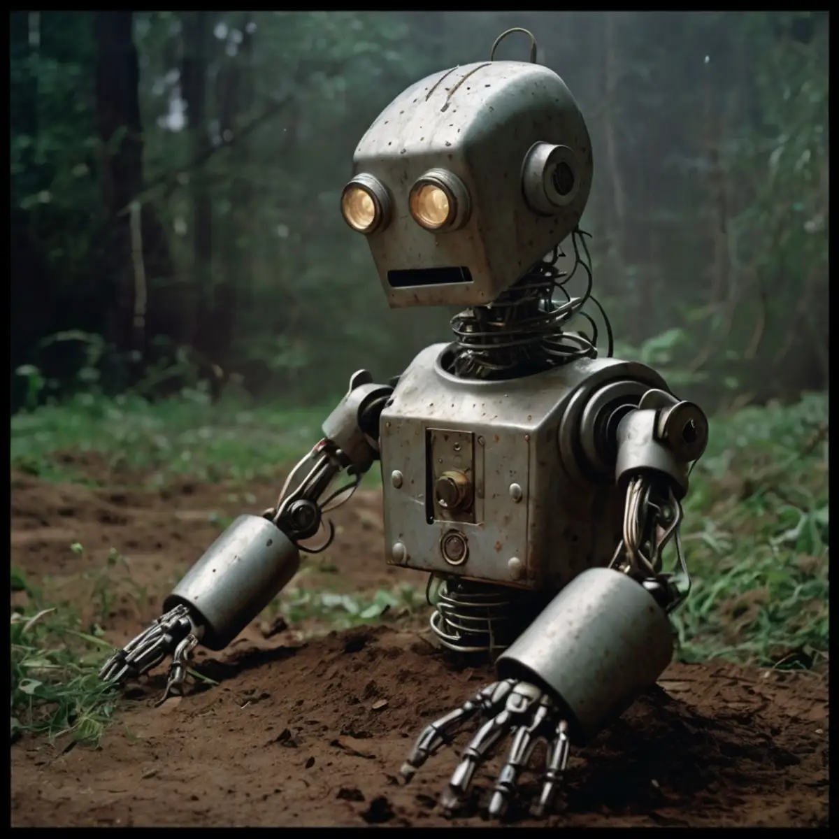 Prompt: A gritty, ethereal depiction of a "robot" graces the cover of this LP album, reminiscent of the iconic 1970s Hypgnosis style. In this dreamlike composition, a solitary figure is captured in a moment of toil and contemplation. The image, likely a photograph, is ultra realistic, conveying a sense of both mundane reality and transcendent beauty. Every detail is painstakingly rendered, from the worn hands and weathered face of the subject to the intricate textures of the environment. The overall effect is mesmerizing, inviting viewers to ponder the human experience within the context of labor and perseverance.
