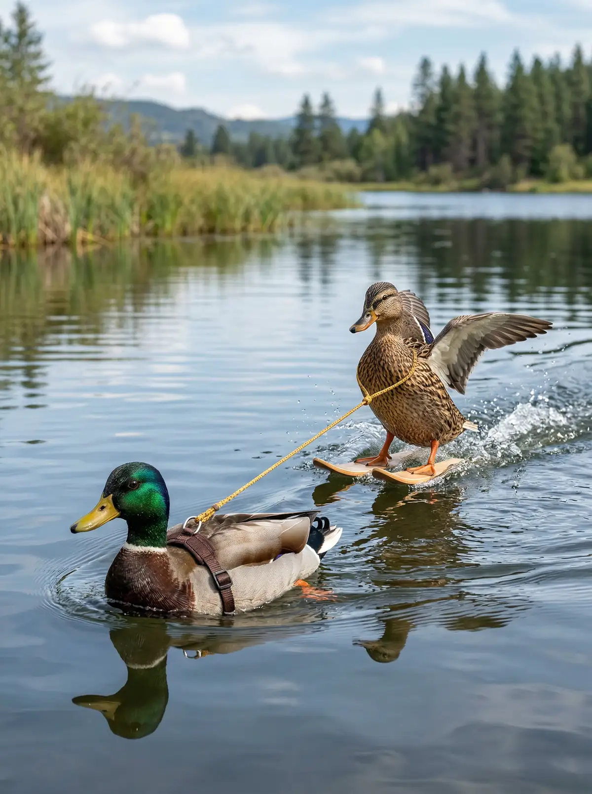 Prompt: Two ducks on a calm freshwater lake, one duck actively pulling another duck behind it on water skis, the leading duck fitted with a small, naturalistic harness secured comfortably around its body, a taut rope extending from the harness to the second duck, which is skillfully water skiing across the surface, realistic duck anatomy with accurate proportions and posture, ultra-detailed feathers with layered structure, subtle color variation, and individual barbs visible, tiny water droplets clinging to feathers and catching the light, dynamic water interaction with crisp splashes, foam, and V-shaped ripples trailing behind the skiing duck, realistic surface tension and reflections on the water, soft wind disturbance across the lake, bright natural daylight with physically accurate lighting and soft shadows, gentle highlights and reflections shimmering on the water surface, shallow depth of field with sharp focus on both ducks and slight background blur, serene lakeside environment with reeds and distant trees rendered in fine detail, atmospheric perspective, cinematic composition, captured as if with a high-end DSLR using a telephoto lens, ultra-high resolution, hyperrealistic, intricate detail, photorealistic, 8k, HDR, global illumination, ray-traced lighting, natural color grading