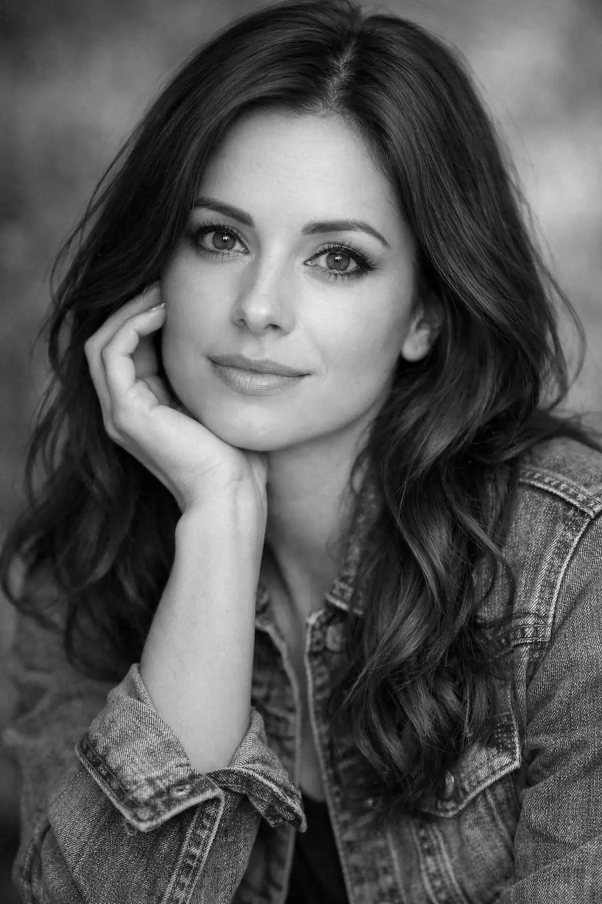 Prompt: A black and white portrait photograph featuring a woman with long, wavy hair cascading over her shoulders. She has a fair complexion and is gazing directly at the camera with a serene expression. Her eyes are large and expressive, framed by well-defined eyebrows and long eyelashes. She rests her chin on her hand, with her fingers gently touching her cheek. The woman is wearing a denim jacket, adding a casual element to the composition. The background is softly blurred, keeping the focus on her face. The overall style is classic and elegant, with a timeless quality due to the monochrome palette.