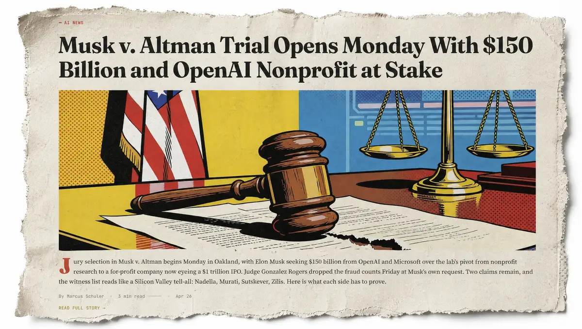 Jury selection in Musk v. Altman begins today in Oakland, with Elon Musk seeking roughly $150 billion from OpenAI and Microsoft over OpenAI's shift from nonprofit research lab to for-profit business.