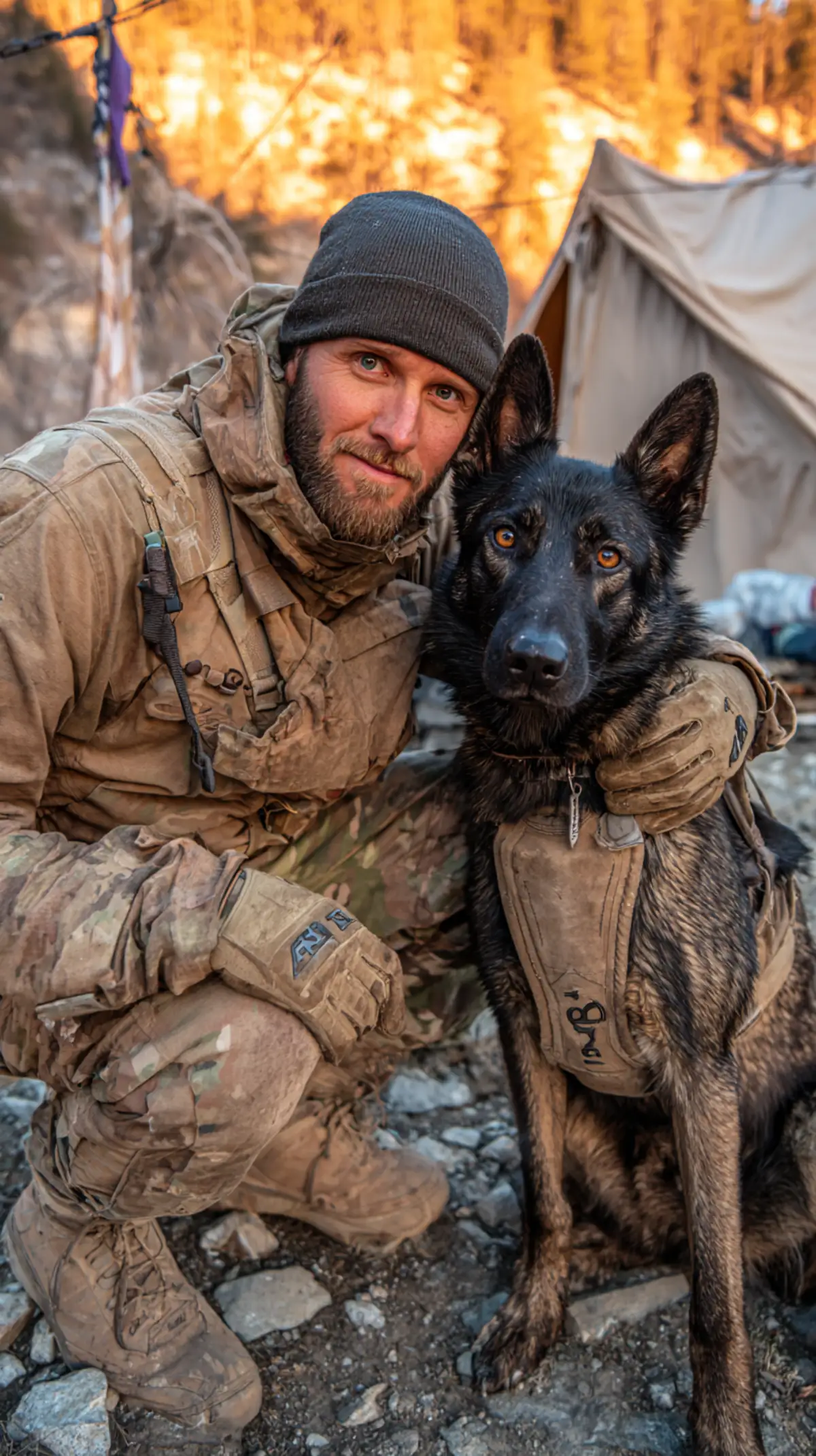 Candid photo capturing a 10-second 4K 24fps video frame--unfiltered, raw real-life texture. Scene: Mountain military camp at dusk: Rocky terrain with scattered campfire stones, canvas tent with frayed edges, canteen hanging from a tent pole; American flag flutters in crisp mountain wind, warm purple-pink dusk light. Characters: 30-year-old white male soldier (short beard, mountain camouflage uniform--rock dust on knees, tactical beanie pulled low, rugged gloves) semi-squatting: one hand holds the phone (selfie angle, faint dirt smudge on lens), the other wraps around the neck of a black-brown German Shepherd (thick coat, military tactical harness with reinforced straps, ear tag marked "K9-189") sitting close. Dynamic: The soldier’s jacket flutters in wind; the dog presses its head against his chest, tail thumping gently. Ambience: Wind howl, distant campfire crackle; details: rock scratches on uniform pants, beanie has a frayed edge, dog’s fur has pine needles tangled, phone case is scuffed from rocks.