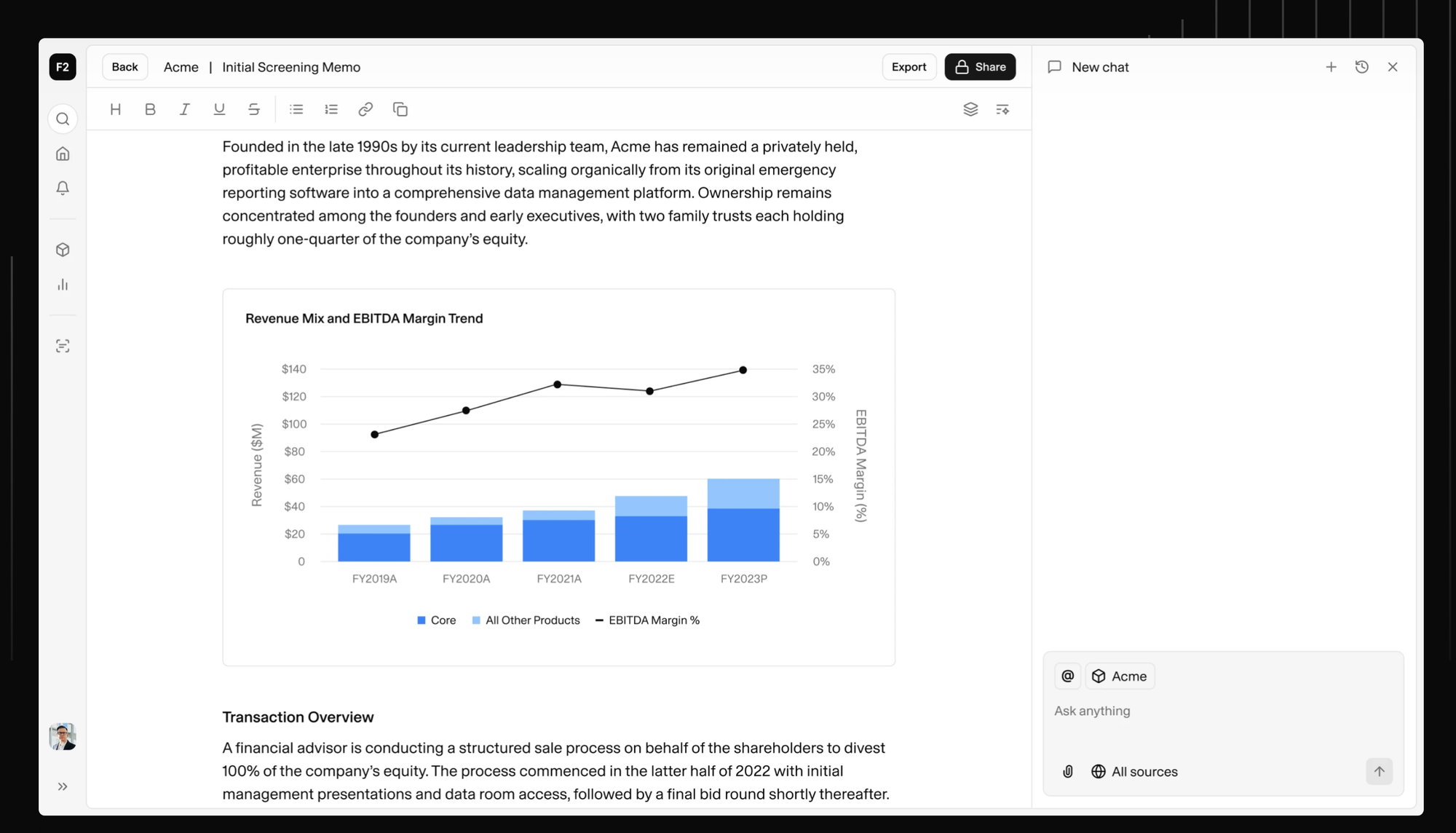 F2 automates deal evaluation for private equity and private credit investors by converting data room files into structured, audit-ready insights. The platform analyzes Excel, PDFs, and presentations 60% faster while retaining historical context across thousands of deals.
