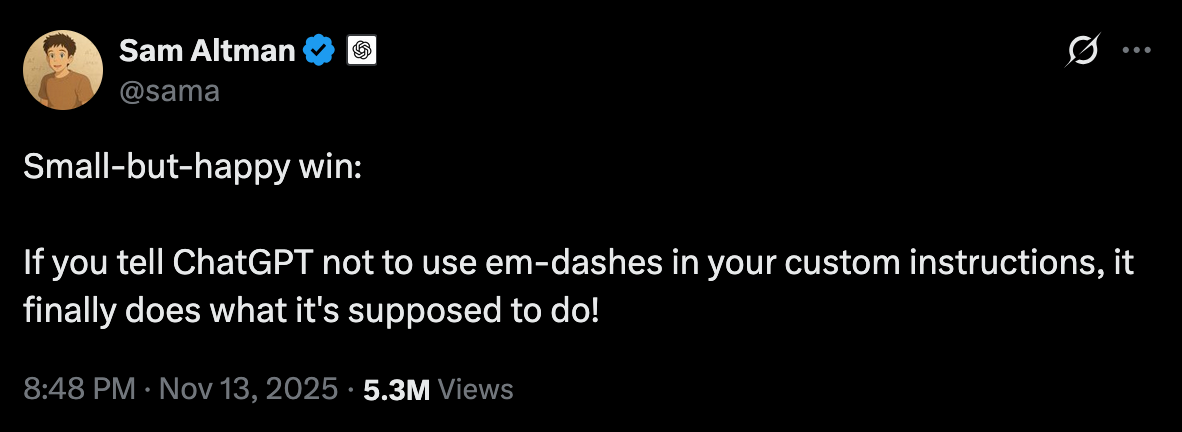 ChatGPT will finally avoid those long punctuation marks if you configure custom instructions correctly. The CEO called it a "small-but-happy win" to 2.4 million X followers. This came two days after OpenAI released GPT-5.1.