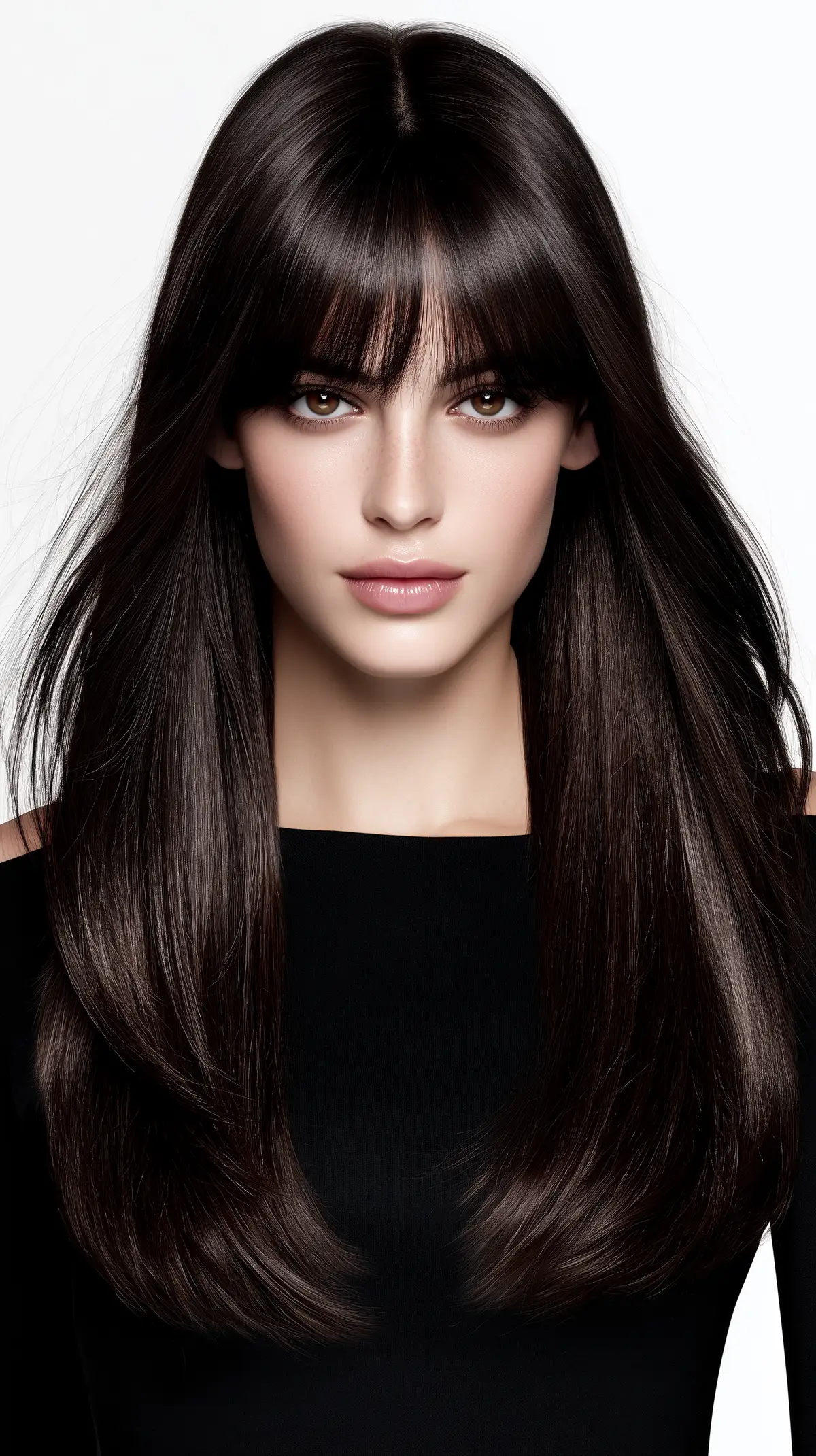 Prompt: Ultra-realistic full-body studio fashion photo of a woman with an elegant look inspired by Anne Hathaway, refined symmetrical facial features, expressive brown eyes, defined cheekbones, dark thick eyebrows, soft full lips, light warm skin tone, long dark brown loose hair falling to the shoulder blades, soft straight bangs framing the forehead, sleek healthy glossy hair texture, slim tall feminine figure, graceful posture, natural luxurious beauty, minimal expensive-looking makeup, standing pose, full length, head to toe visible, centered composition, isolated on pure white background, clean studio lighting, soft even shadows under feet, realistic proportions, photorealistic skin texture, premium fashion campaign aesthetic, highly detailed, sharp focus --ar 9:16 --profile dlnii1r