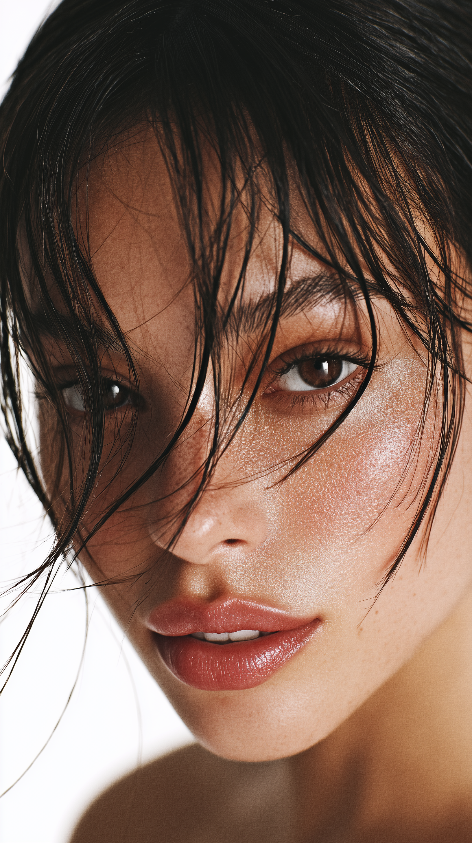 A realistic close-up portrait of a young woman with dewy, glowing skin, naturally flushed pink cheeks, and glossy soft pink lips. One single thin, wet black hair strand falls perfectly across the center of her face, while the rest of her hair is sleek and controlled no extra messy strands. Her forehead is smooth, and her makeup is clean, modern, and minimalistic, emphasizing natural beauty. The woman stares directly into the camera with an intense, captivating gaze that feels both vulnerable and powerful. Harsh flash lighting accentuates every fine skin texture detail, creating a tactile, high-fashion feel. The background is plain white, amplifying the subject’s presence. Captured in sharp focus and ultra-high resolution, styled as a cinematic editorial beauty photograph taken with a Hasselblad camera refined, intimate, and modern.