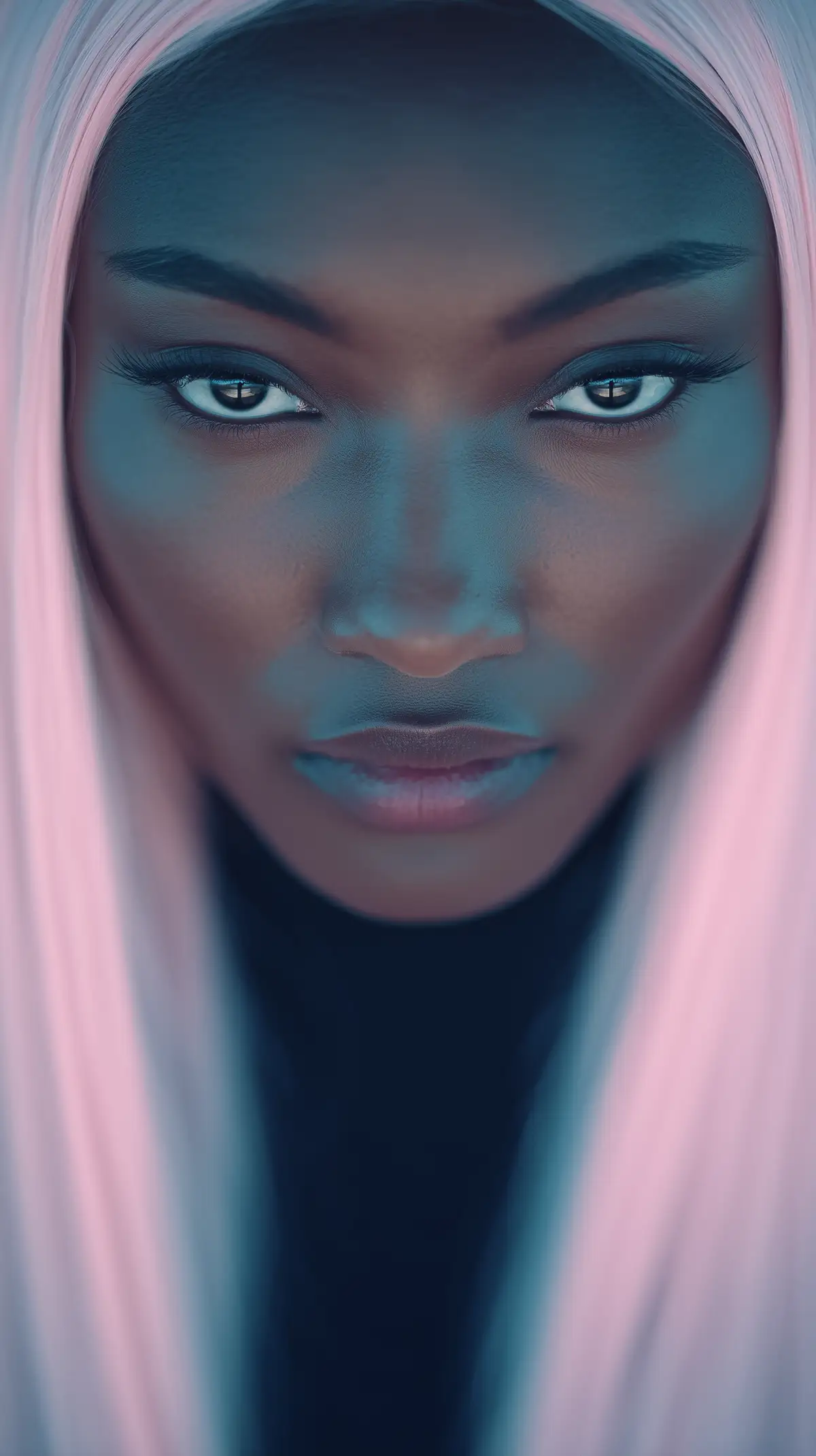 Ultra-realistic, fine-art portrait photograph of an impossibly beautiful black alien woman, captured with a Canon EOS R5 and an 85mm f/1.4 L-series prime lens. Hyperdetailed, shallow depth of field, soft cinematic lighting, exquisite color grading the atmosphere feels sacred and dreamlike, as if shot by a French haute couture photographer of another planet. Her flawless pink skin glows with a smooth, silken sheen, softly illuminated by diffused light that caresses every contour like the hand of a lover. Her straight, luminous pink hair falls fluidly around her shoulders, gleaming like strands of pastel starlight. Her enormous, perfectly black eyes vast and liquid as cosmic obsidian dominate the face, swallowing the universe within. There is no white in them, only endless, reflective depth. Her eyelashes are impossibly long and delicate, like whispers of light around the darkness. Her nose is almost invisible, a mere shadow of form so small that only the faint suggestion of nostrils remains, elegant and otherworldly, as if sculpted from breath itself. Her lips are soft and subtly curved, hinting at a serene knowledge of cosmic scales. Lighting: soft studio glow with gentle rim light outlining her pink silhouette, every photon worshipping the harmony of alien femininity. Background dissolves into a graceful haze of lavender mist, faint stars and silver dust. The aesthetic is hyperreal and philosophical, a mix of fine-art portraiture, high-fashion editorial, and divine surrealism. She is the embodiment of purity beyond species beauty distilled into form, color, and cosmic tenderness.
