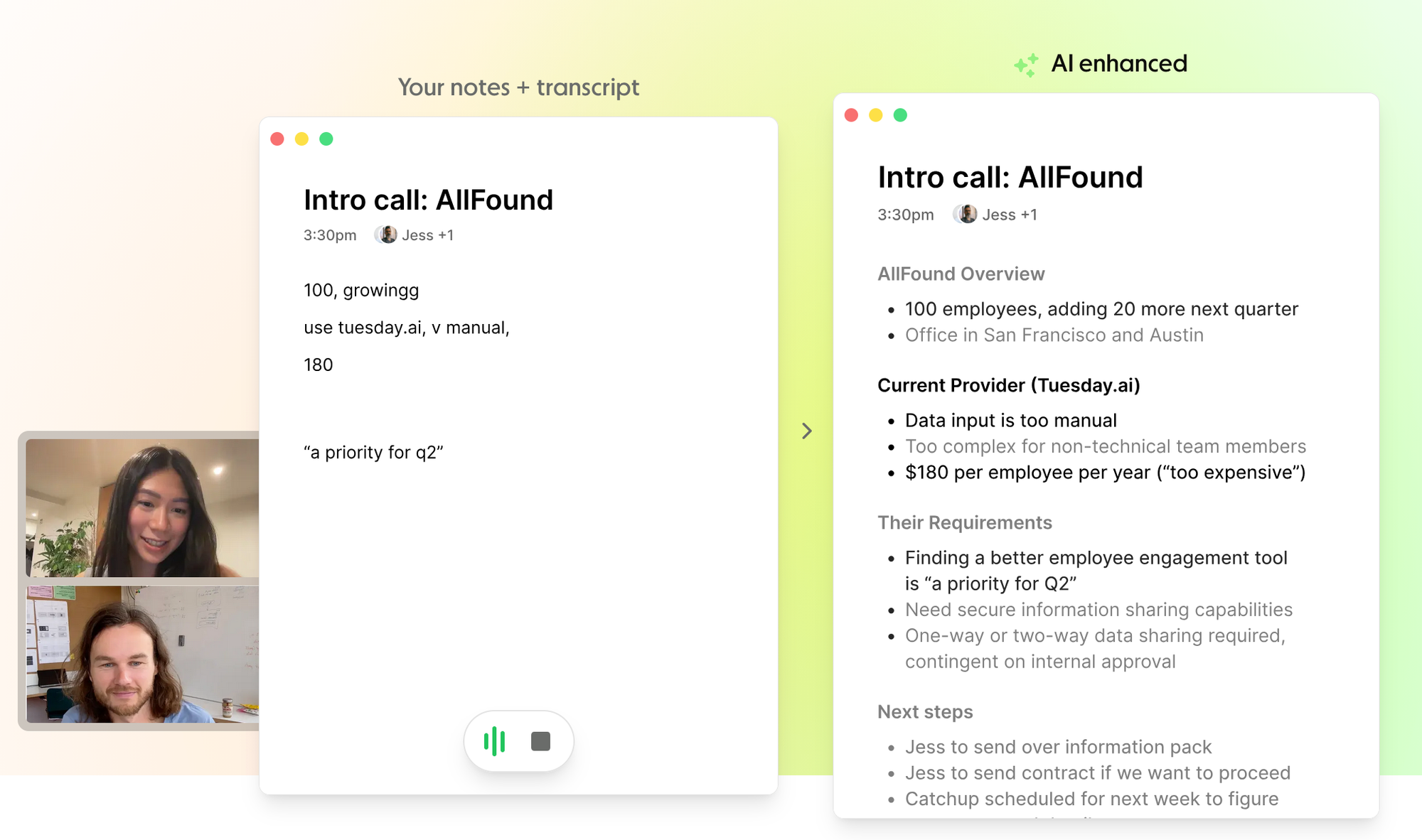 Granola works like a notepad that secretly listens. You jot down what matters. The app transcribes everything else. After the meeting, AI merges both into a structured summary with action items. No awkward bot joins your call. No audio gets stored. Just text. The company added team folders and cross-meeting search in 2025, pushing toward a shared workspace play.