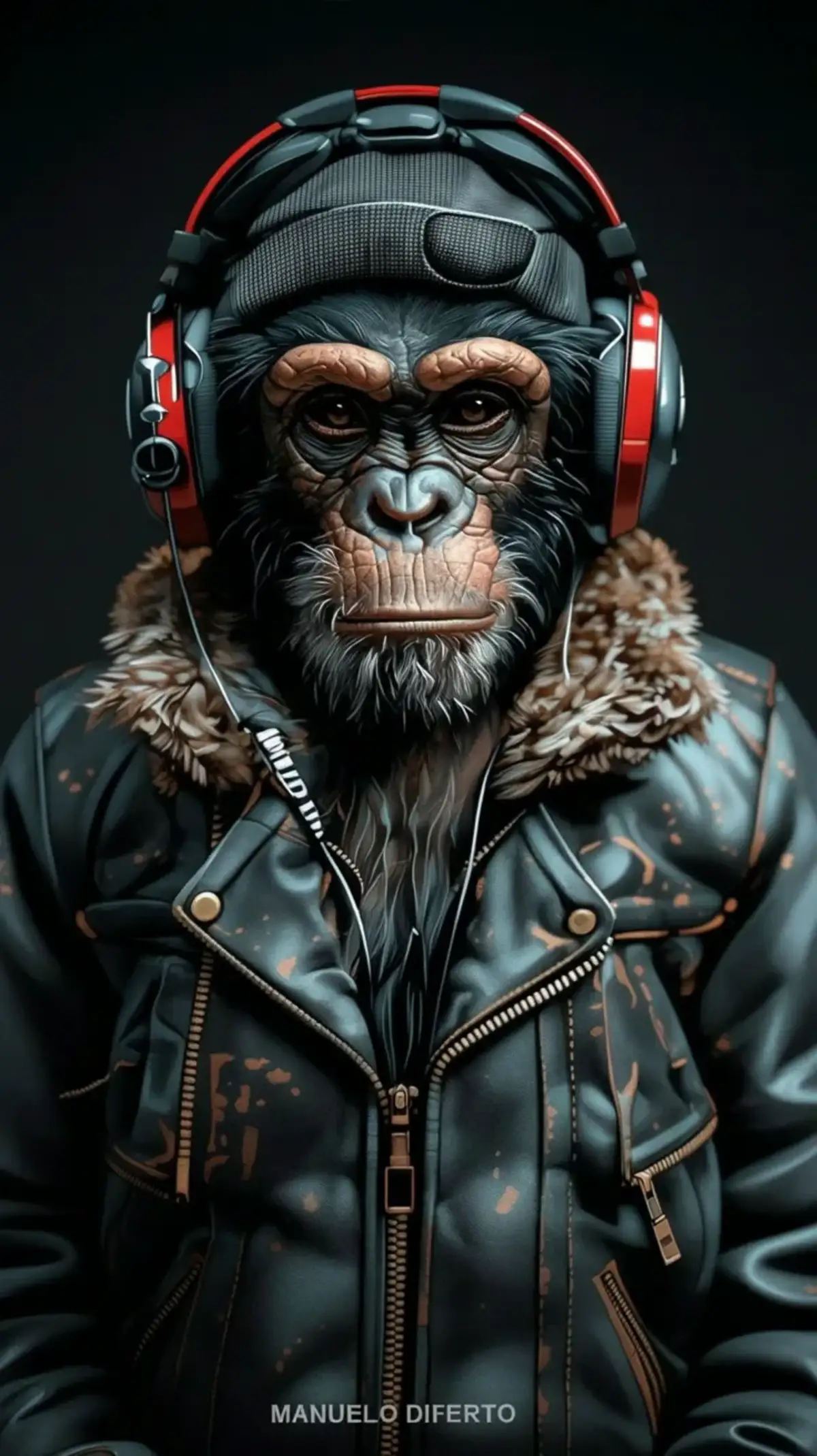 Prompt: A hyper-realistic portrait of an elderly chimpanzee wearing a black leather aviator jacket with fur collar and a pair of red and black over-ear headphones. The chimpanzee has a wise, serious expression, with deep wrinkles around the eyes and mouth, and a graying beard. The fur on its face is highly detailed, with realistic textures and subtle variations in color. The aviator jacket is worn and slightly weathered, with visible stitching, zippers, and a soft fur lining around the collar. The headphones are sleek, modern, and snugly fit over the chimpanzee's ears. The background is completely black, creating a dramatic contrast that highlights the subject. The lighting is cinematic, with soft shadows and highlights that emphasize the textures of the fur, leather, and headphones. Ultra-high detail, 8K resolution, photorealistic rendering, and rich textures.