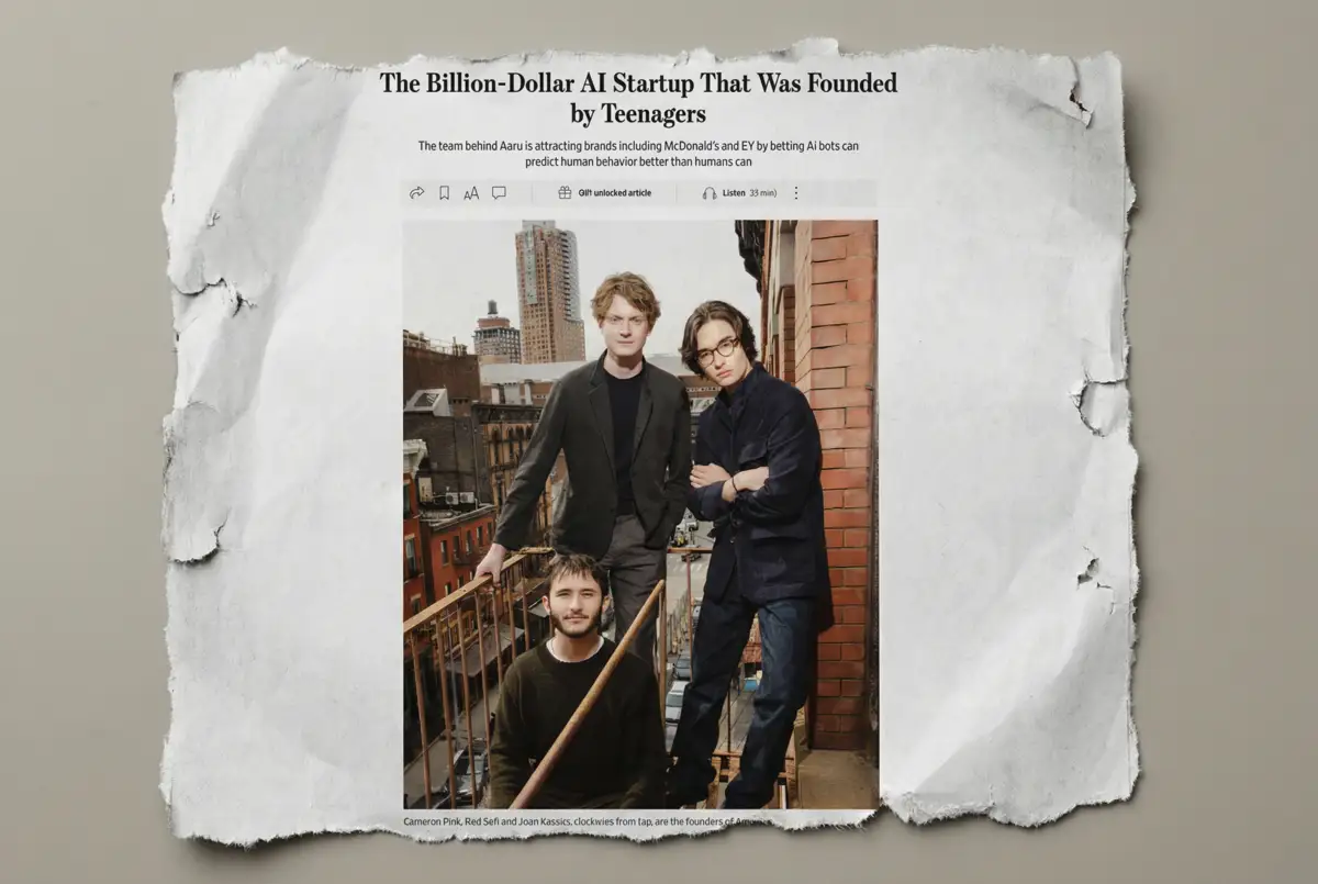 Aaru, an AI startup founded by two teenagers who spent one night at Dartmouth and two weeks at Harvard before dropping out, reached a $1 billion valuation by replacing human focus groups with AI bots. EY tested Aaru's synthetic respondents against a yearlong survey of 3,600 real people and found the bots more accurate. The youngest co-founder is 17 and cannot legally sit on his own board.