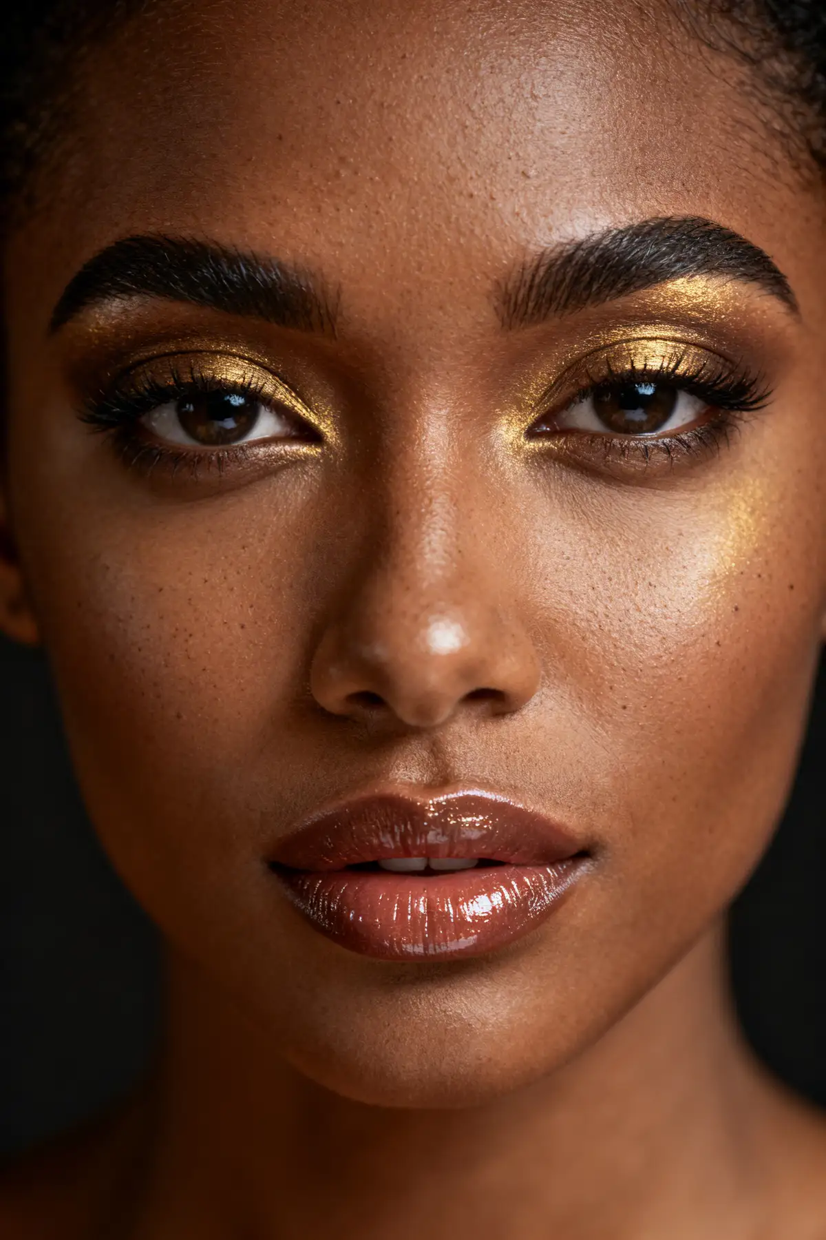 Prompt: Ultra realistic close-up portrait of a 27 year old woman, deep brown skin tone, natural skin texture with visible pores, elegant evening makeup, defined eyebrows, glossy lips, direct eye contact, cinematic soft lighting, 85mm lens, RAW DSLR photo, realistic imperfections, neutral dark background