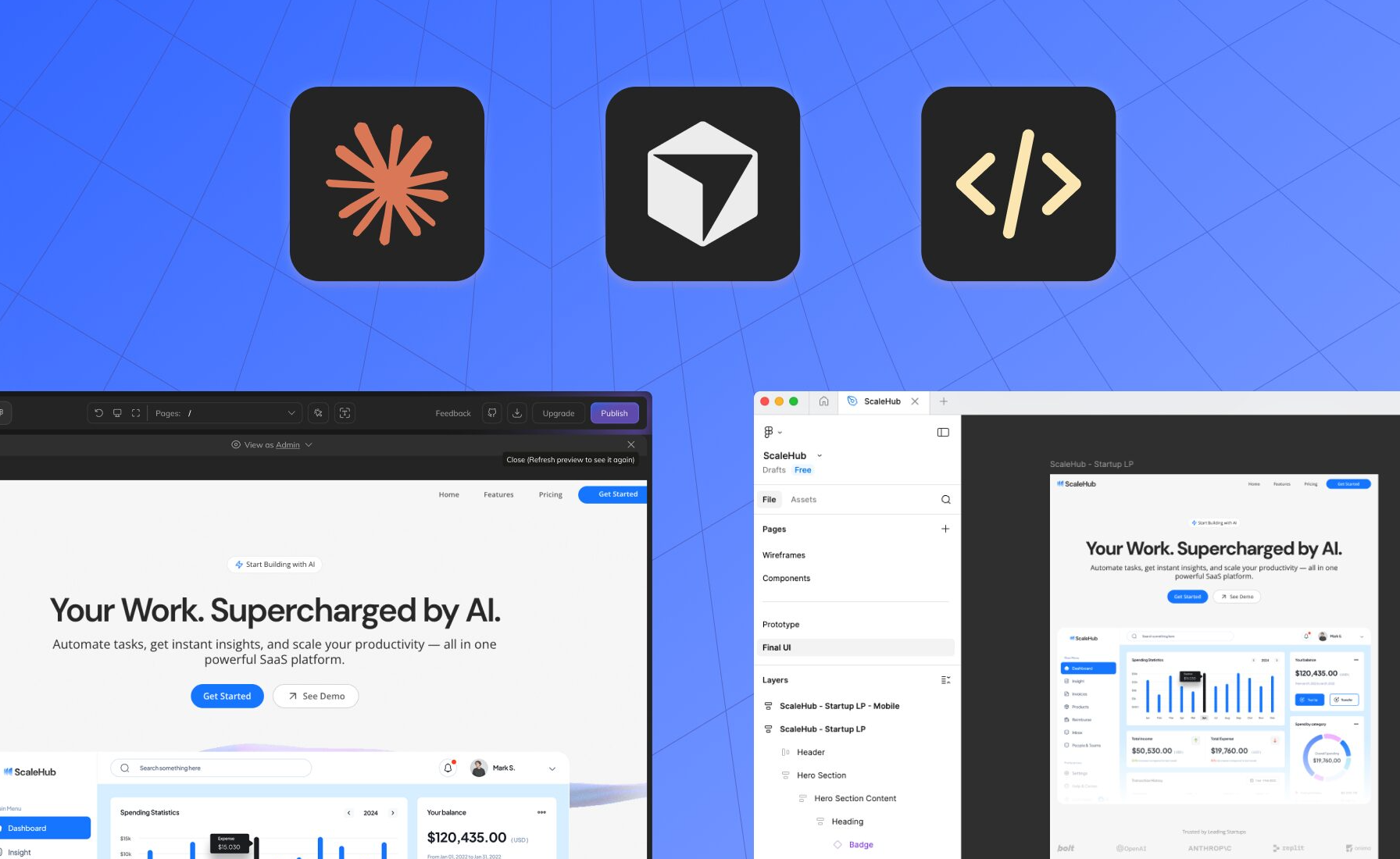 Anima converts design files into functional React, Vue, or HTML applications. Paste a Figma URL, upload a screenshot, or describe what you want in plain language. The platform generates deployable code with built-in data modeling and one-click deployment. Used by 1.5 million creators.