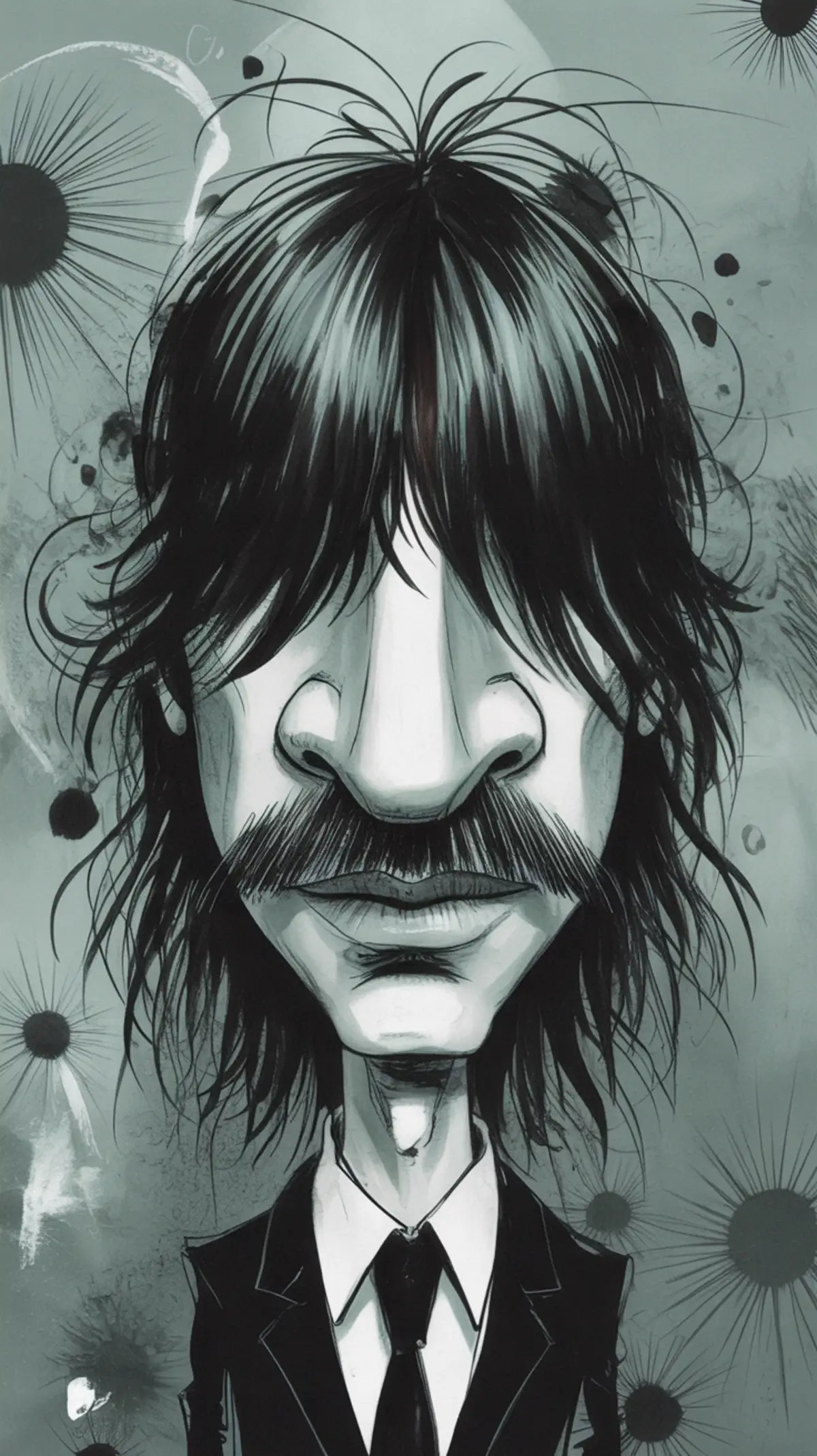 Prompt: In a minimalist and impressionistic style, a largesquare nose dominates the center of a piece of paper, sketched in bold pen strokes and shaded with delicate watercolors. Long, shaggy black and white fringes obscure the eyes, while a prominent square moustache adds character to the caricature. Warm hues of sepia and soft grays create a cozy, inviting atmosphere, capturing the essence of the man's face in a uniquely artistic manner.(736 x 1312)