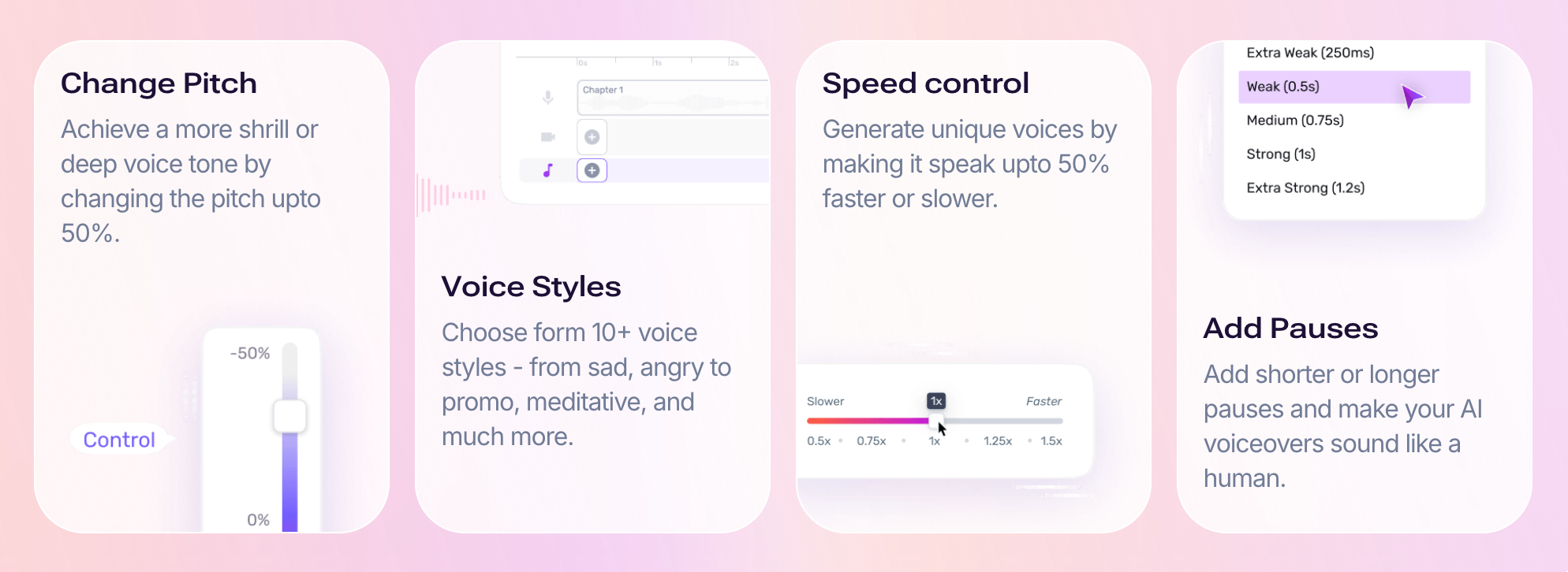Customize your voiceover by adjusting pitch, speed, emphasis, and pauses for natural delivery