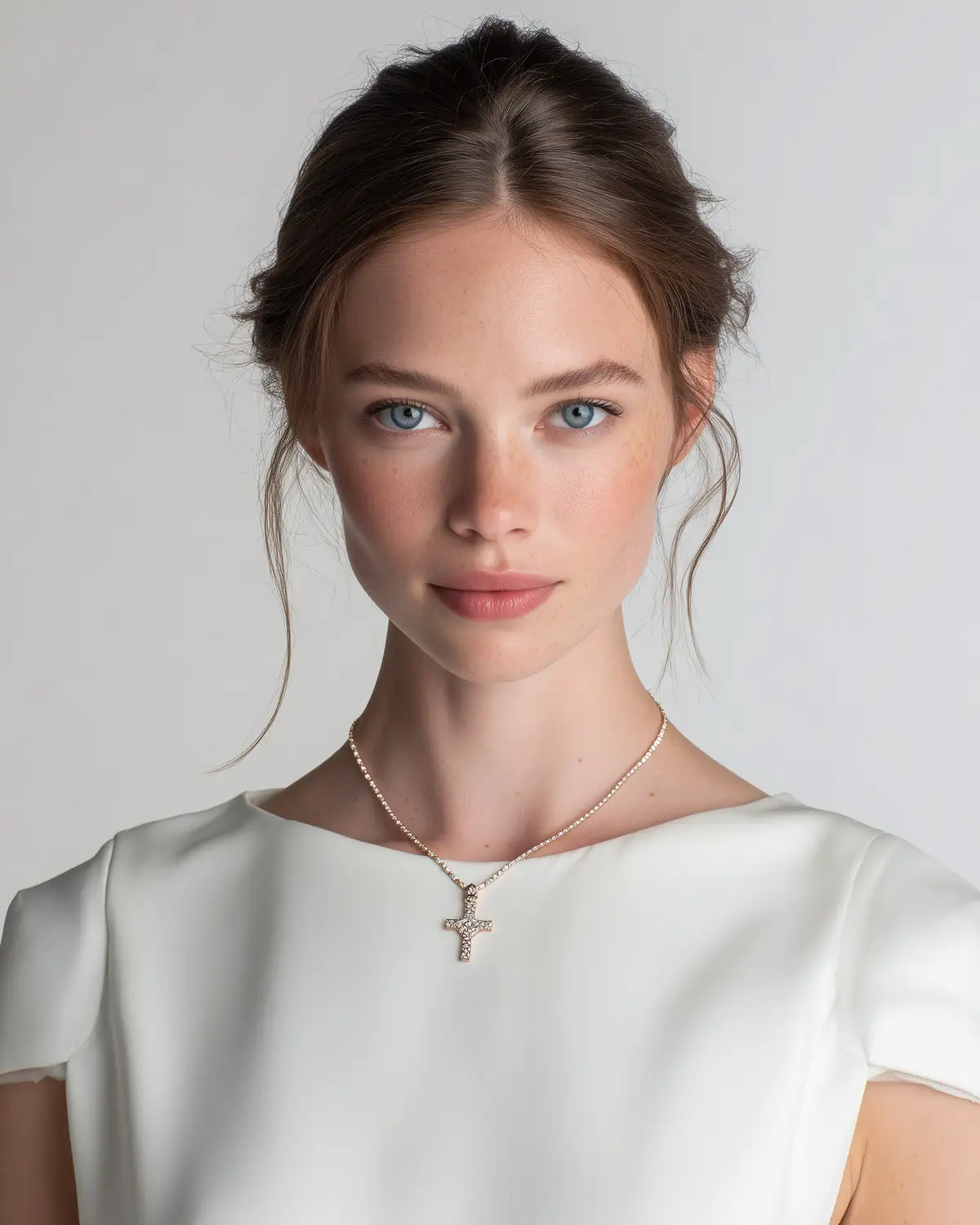 Prompt: a model wearing an elegant white dress with shoulder-length sleeves, featuring a simple yet luxurious necklace adorned with small diamonds and yellow sapphires in the shape of a cross pendant around her neck. she has her hair tied back, showcasing minimal makeup to highlight her blue eyes, standing against a plain background for a clean look. the focus is on the intricate details of both the jewelry pieces and the attire, capturing the soft studio lighting that accentuates their features.
