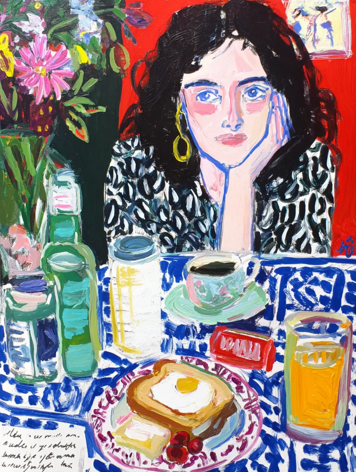 Prompt: a vintage minimal iranian breakfast tabel ,woman . style, soft texts visible on the some areas handwriting, flat hand-painted illustration