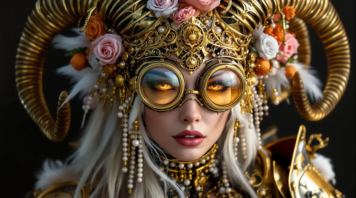 Prompt: A highly detailed closeup portrait of a fierce female warrior in steampunk cyberpunk style with layered mechanical details