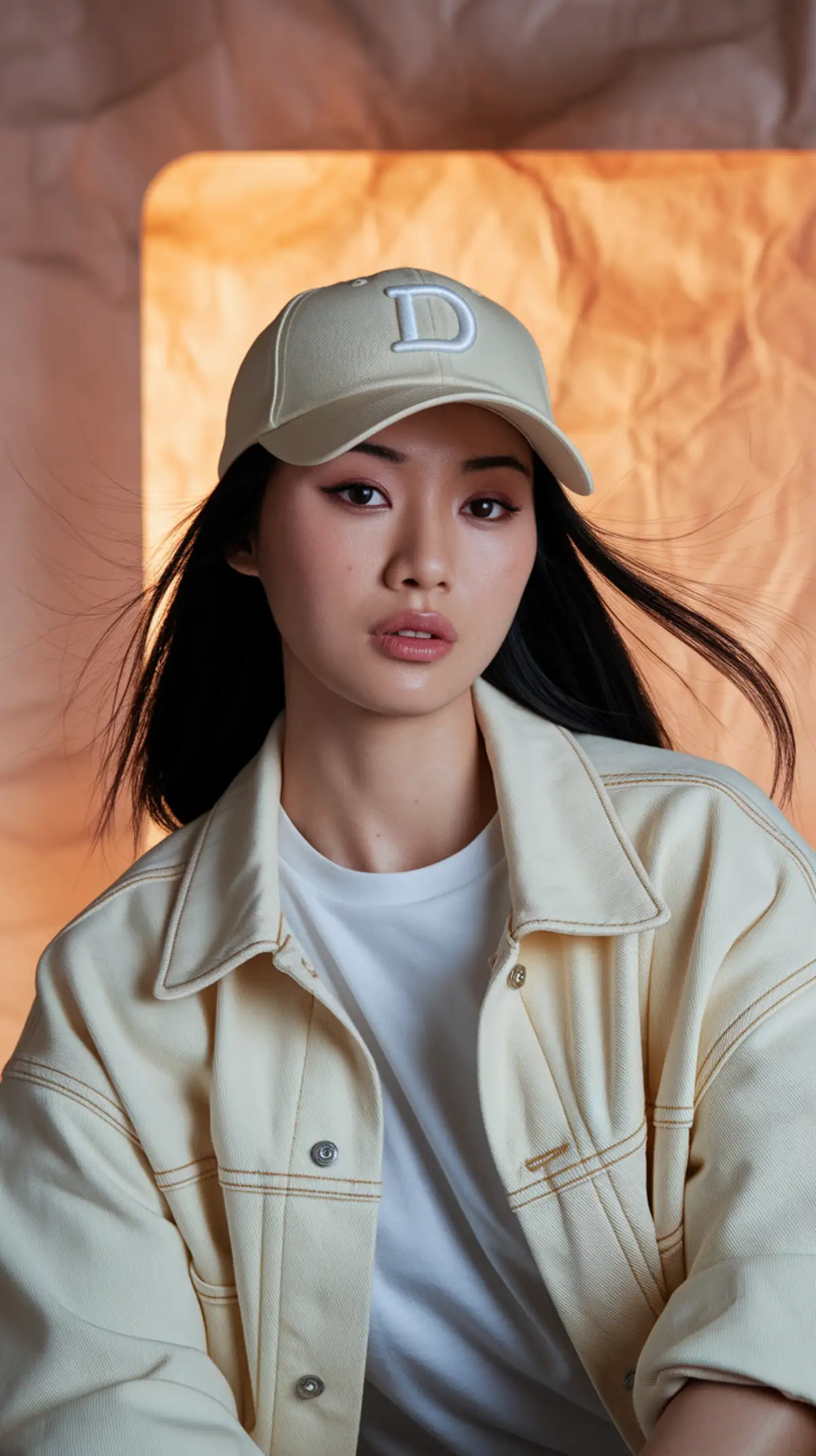 capturing a stunning Asian woman with fair skin in a contemporary studio setting. She wears a cream baseball cap displaying a prominent "D" logo, paired with flowing black hair and a cream denim jacket over a pristine white t-shirt, her gaze meeting the camera with tranquil confidence and subtle, natural makeup. Warm, diffused lighting gently illuminates her face and highlights the cascading strands of her hair, while a textured, soft-focus background of aged parchment adds depth and a sense of timeless elegance. The composition is meticulously symmetrical, focusing sharply on her face and conveying a minimalist, fashion-forward aesthetic, bathed in a golden, inviting glow.