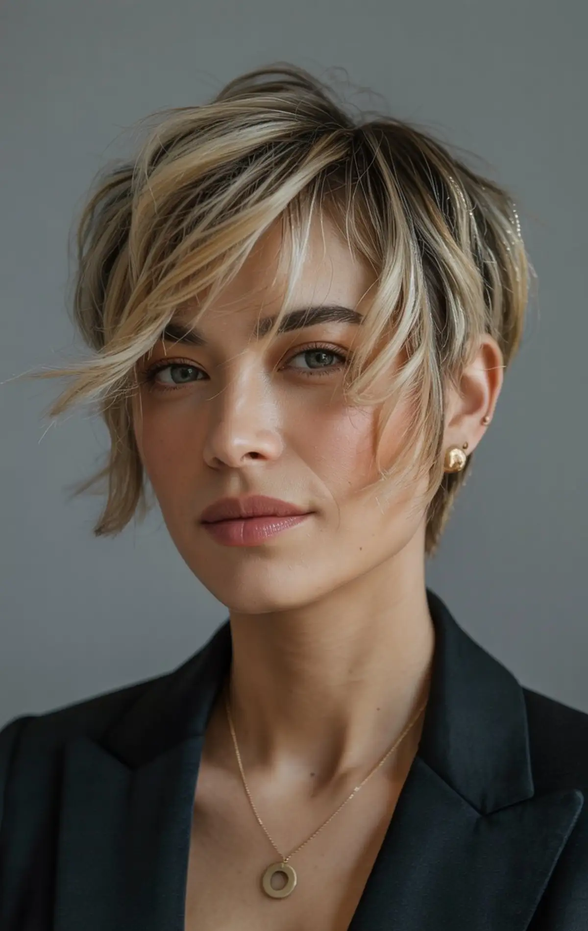 Prompt: A professional portrait photograph against a plain gray background features a confident individual with a short, layered blonde pixie cut featuring subtly darker roots and wispy bangs playfully swept to one side. Their features are framed by a black blazer and a delicate gold necklace displaying a circular pendant, complemented by understated gold stud earrings, enhancing their sophisticated and approachable demeanor. Soft, diffused lighting gently illuminates their face, accentuating the dimensional quality of their blonde hair and natural makeup, while creating subtle shadows that add depth and dimension. The background remains a clean gray, allowing the subject to take center stage with an overall muted color palette that emphasizes the warm tones of their hair and creates a polished, timeless aesthetic.