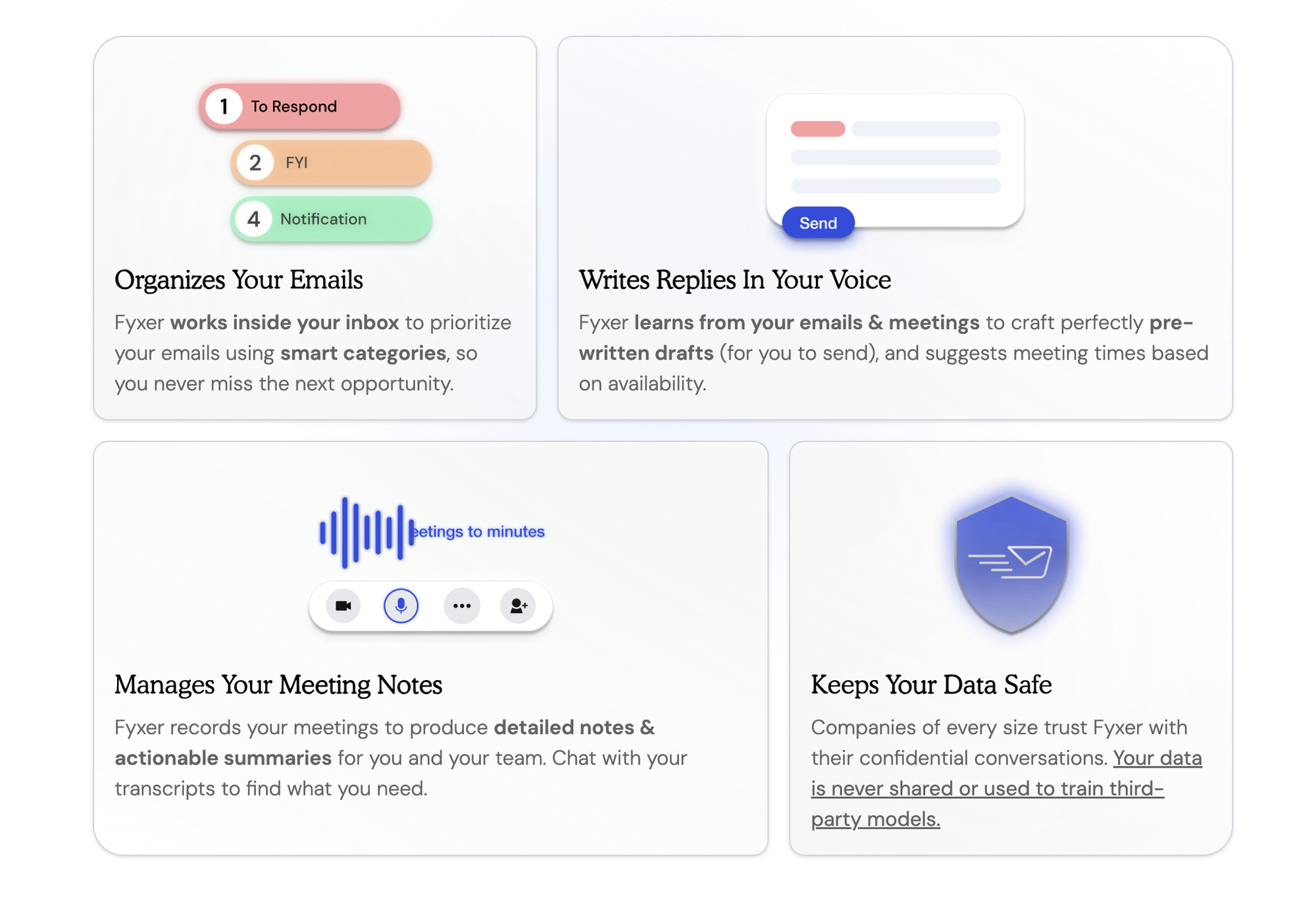 Fyxer AI connects to your email and calendar to draft replies, organize messages, and take meeting notes. It learns your writing style and handles routine email work so you can focus on what matters.